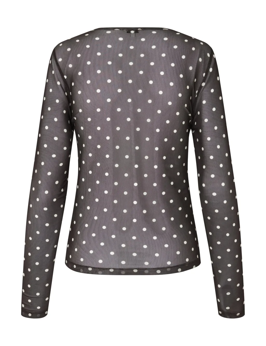 Langærmet bluse fra MbyM med hvide prikker på sort, semi-transparent stof. Blusen har rund halsudskæring og pulloverdesign.