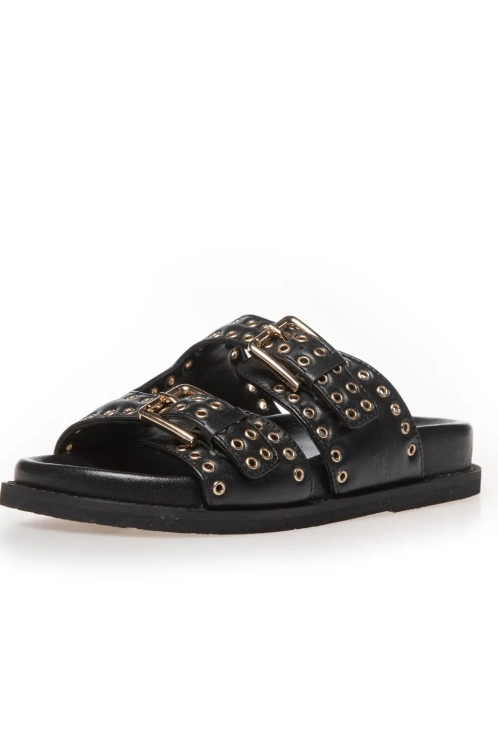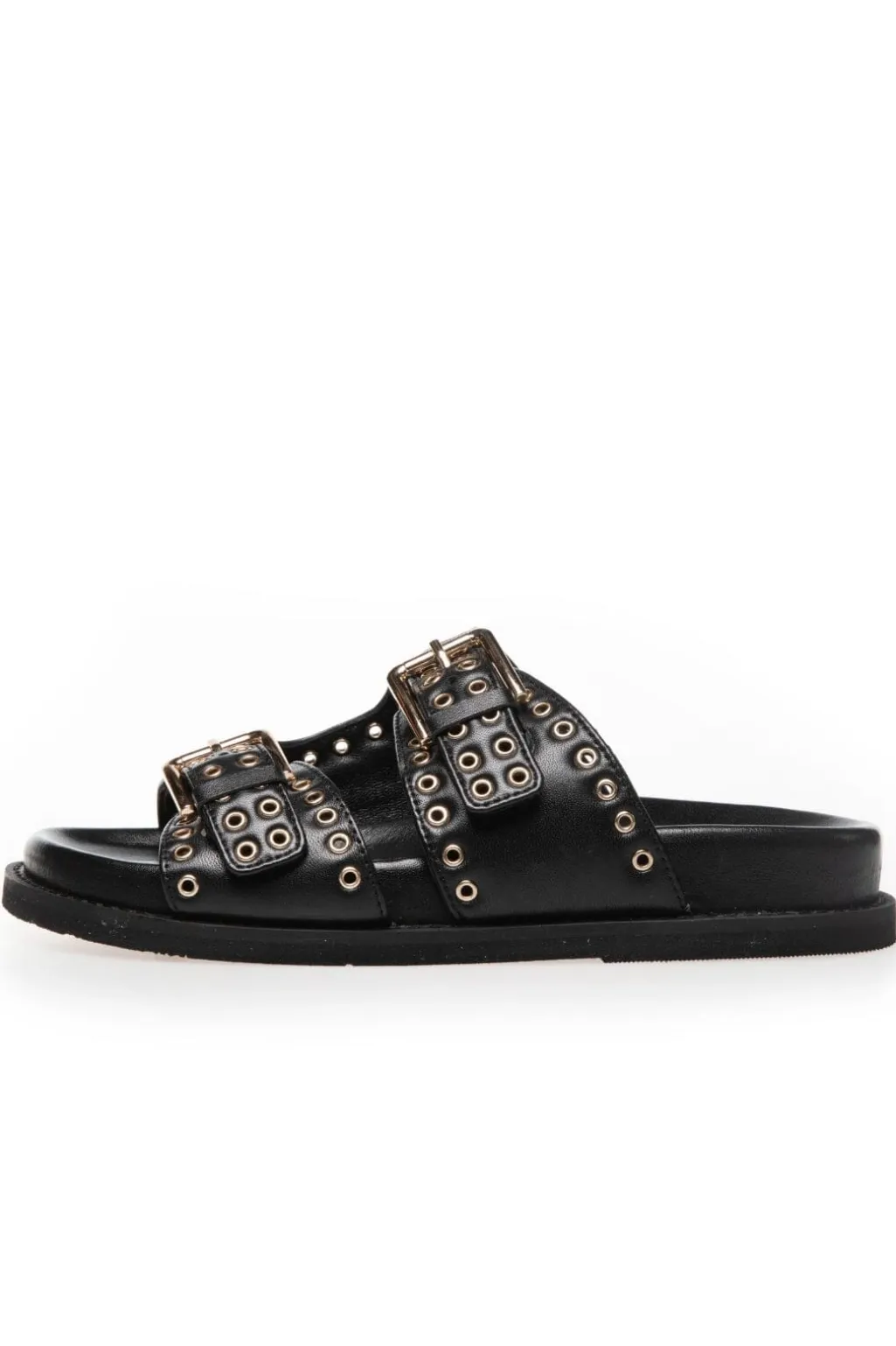 Sort lædersandal fra Copenhagen Shoes med to brede remme og metaldetaljer. Sandalen har dekorative huller og spænder, der giver mulighed for at justere pasformen.