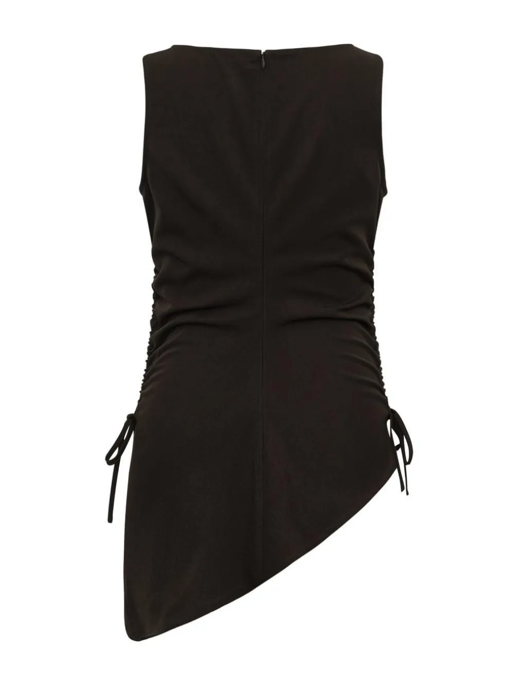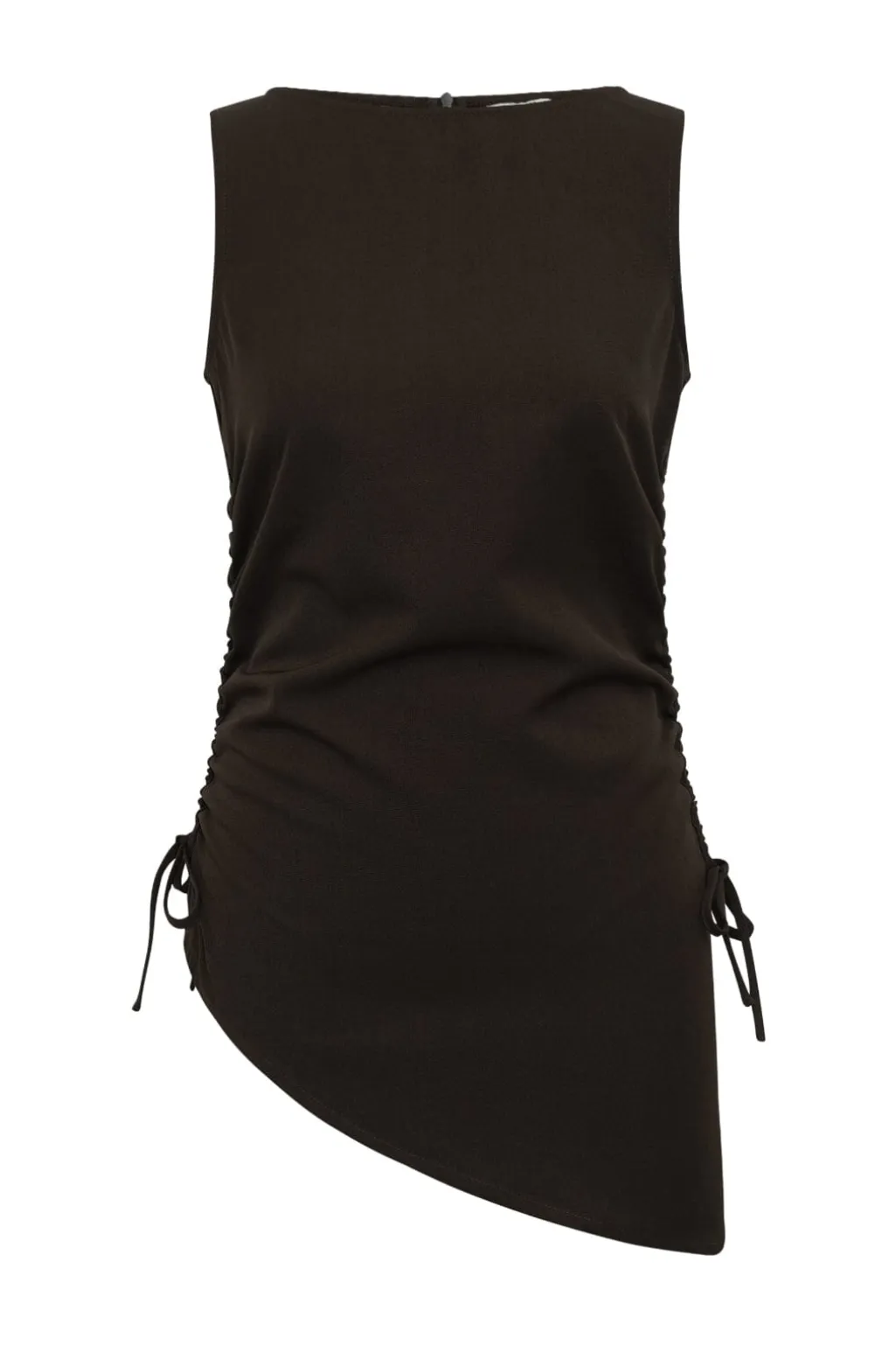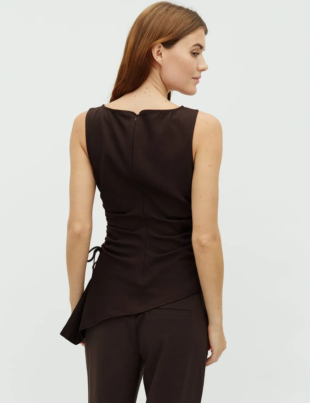 Mørkebrun kjole fra MbyM, lavet af 100 % polyester. Den har et ærmeløst design med en asymmetrisk kant og justerbare snore langs siderne.