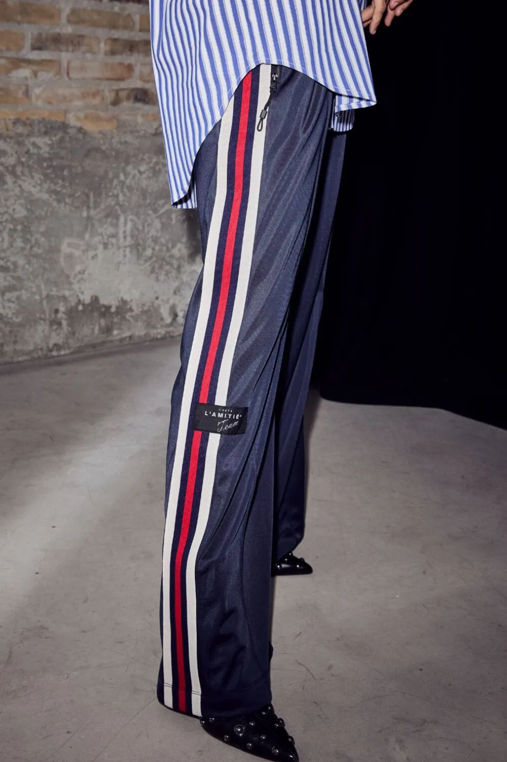Mørkeblå track pants fra Haute L’Amitié med løs, baggy pasform. Bukserne har dekorative syninger og et stribet design langs siderne.
