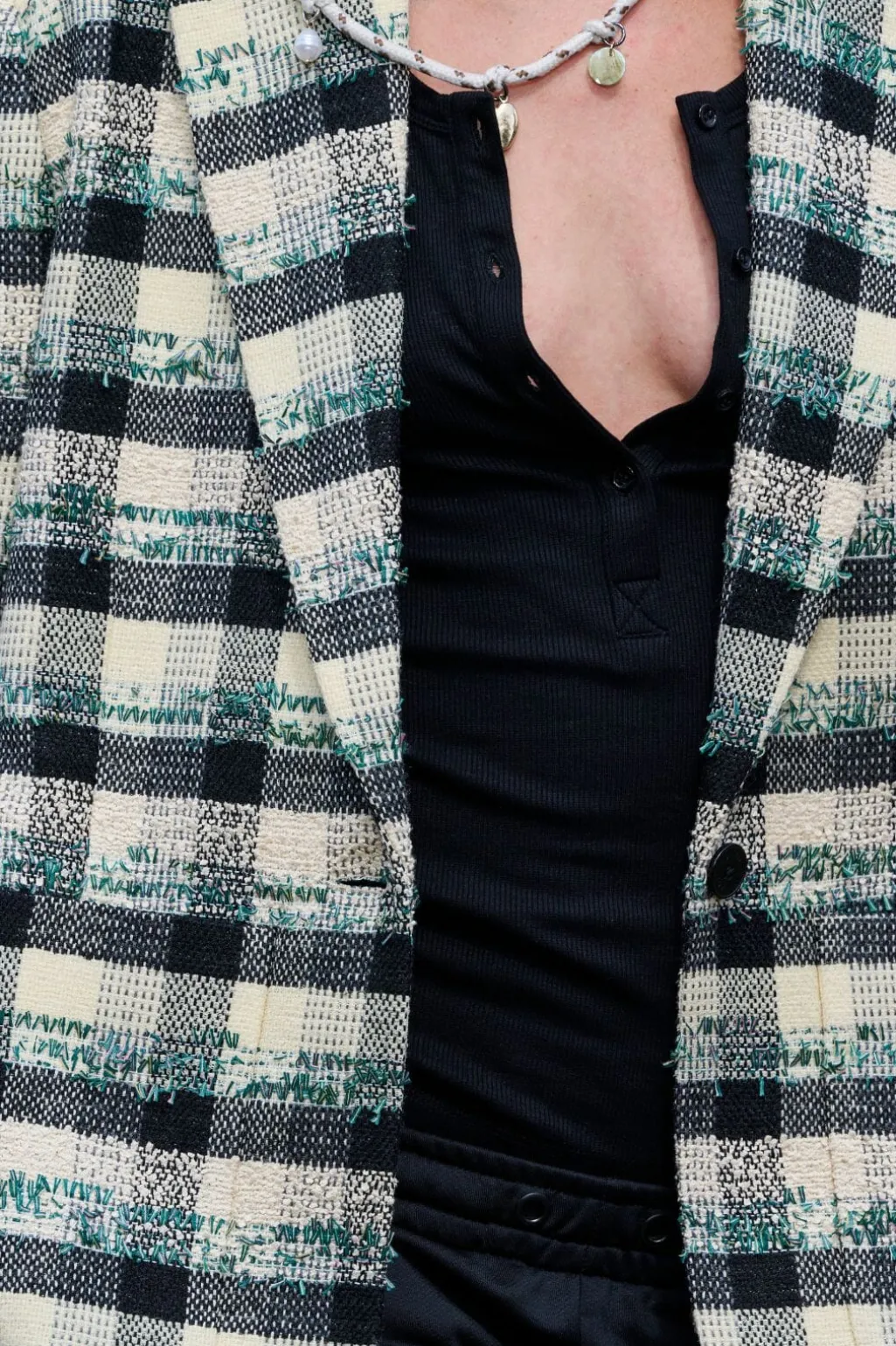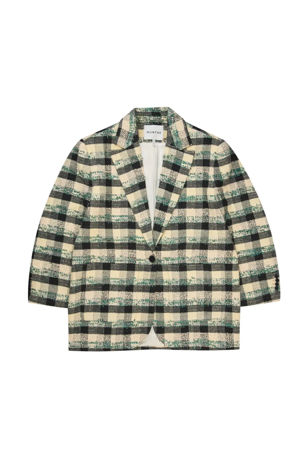 Ternet blazer fra Munthe i sort, creme og hvid. Blazeren har en let oversize-pasform og er lavet af blød, vævet kvalitet med 53 % polyester, 33 % akryl og 14 % uld.