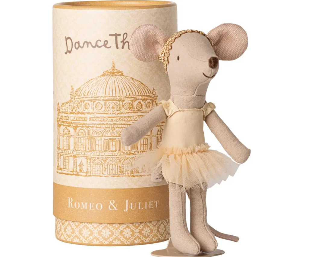 En musedukke klædt som balletdanser fra Maileg. Musen har en gul tylskørt-balletkjole og et gyldent hovedbånd. Leveres i et rør med stativ.