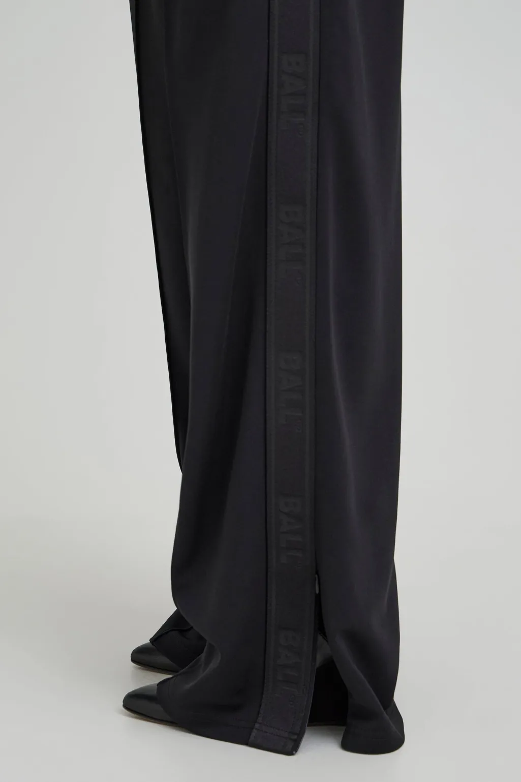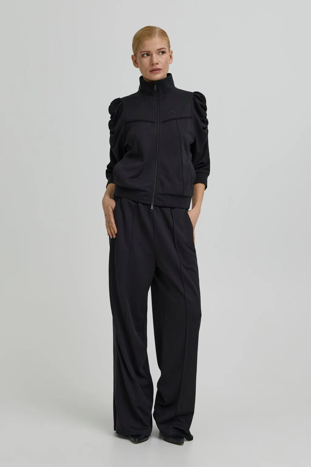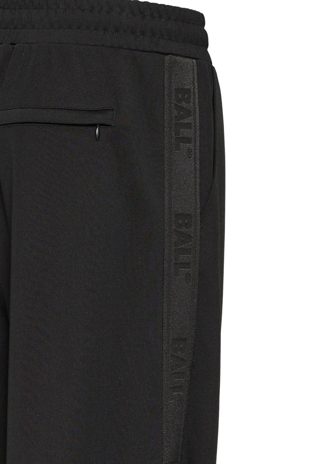 Sorte trackpants fra Ball, lavet af 100 % polyester. Bukserne har en løs pasform og en lang længde ned til gulvet.