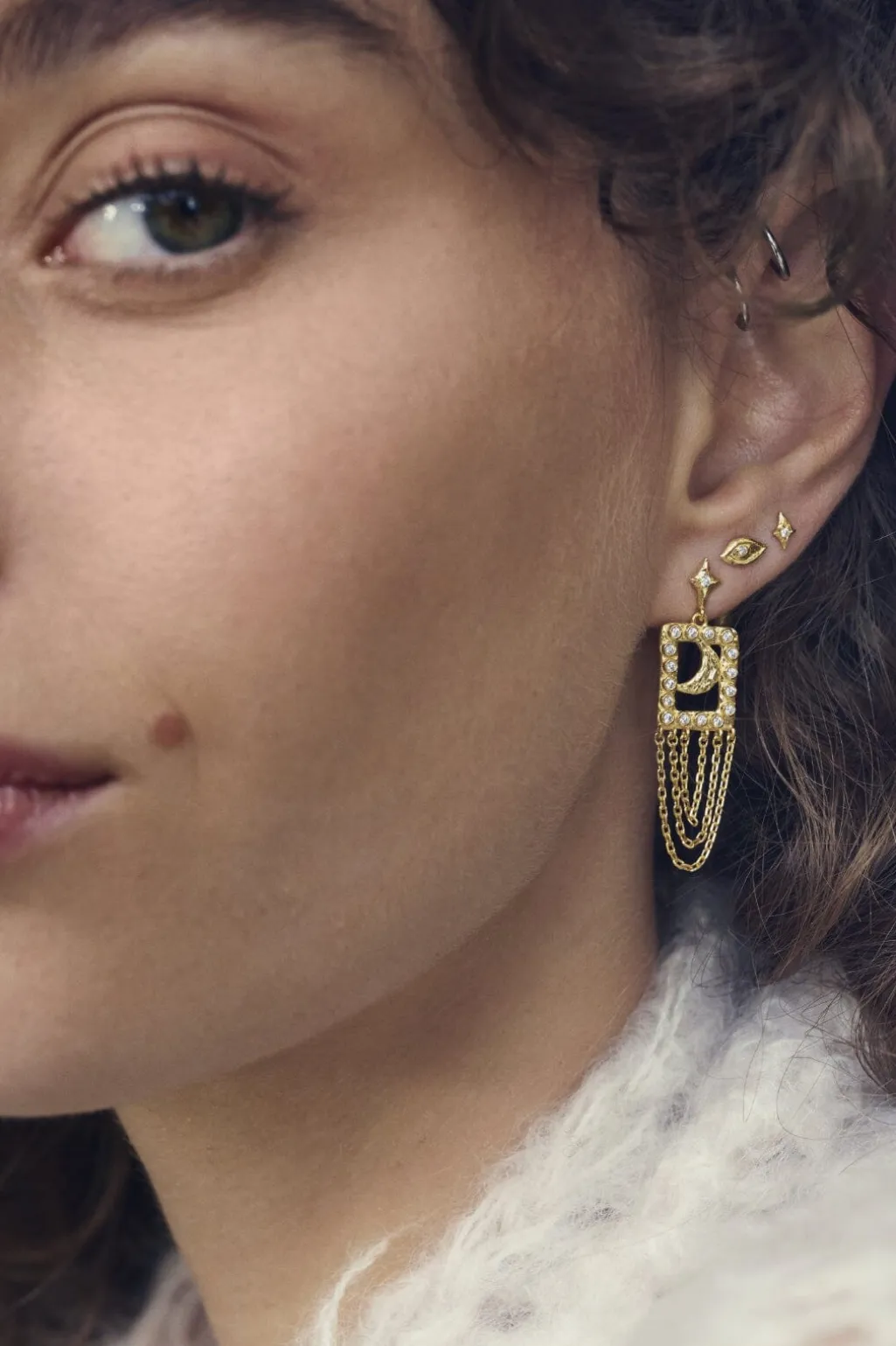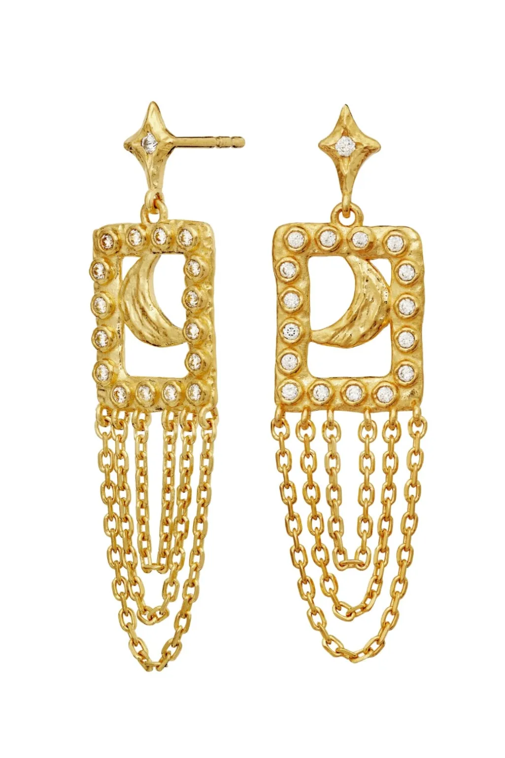 Øreringe fra Maanesten med et halvmåneformet design. Lavet af genanvendt sterlingsølv belagt med 18 karat guld og dekoreret med zirkoner.
