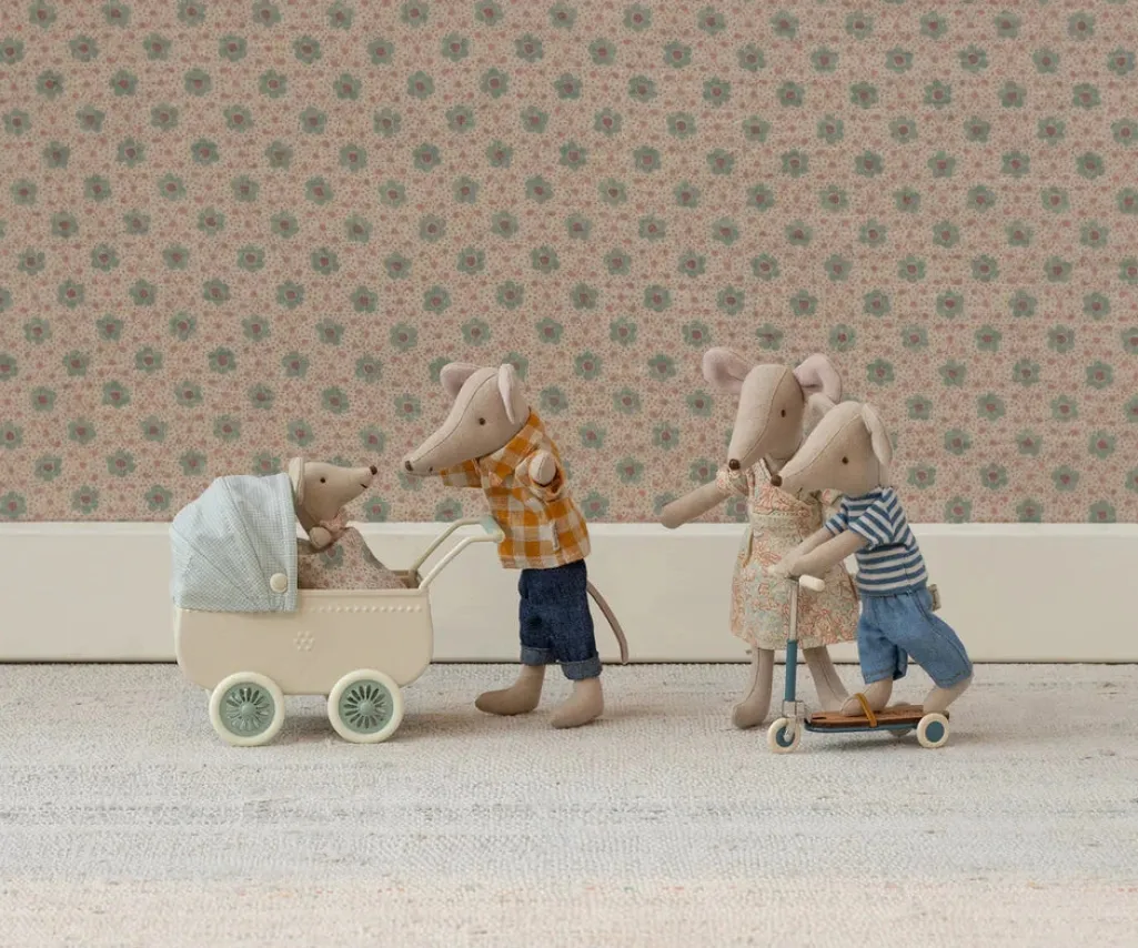 Mintgrøn barnevogn fra Maileg med babymus, sovepose og madras. Barnevognen har en lys base med mintgrønne hjul og kaleche i et let stof.