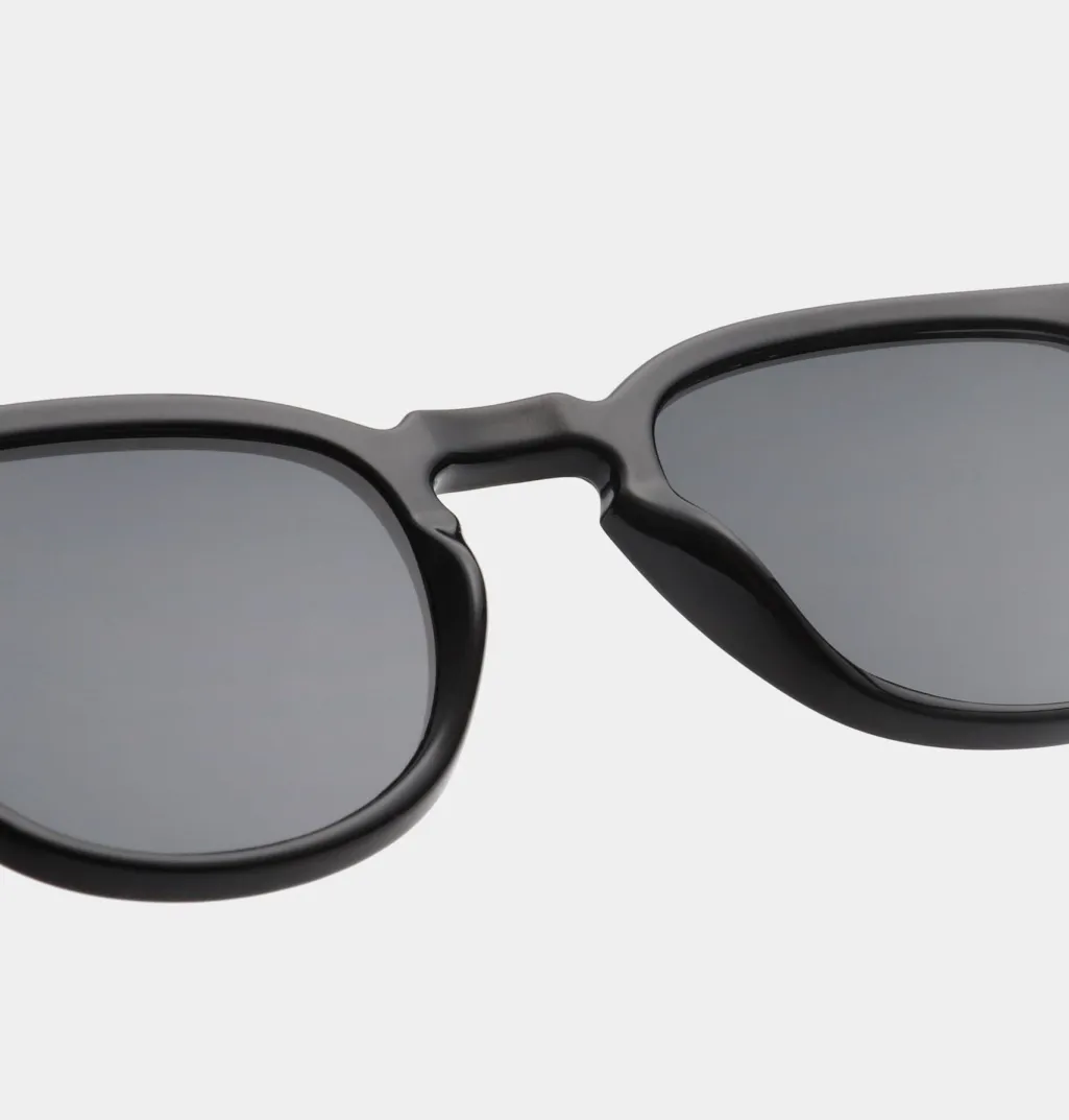 Sorte solbriller fra A. Kjærbede i Wayfarer-form. Stellet er lavet af Tritan Renew med polycarbonatlinser og UV400-beskyttelse. Brillerne har formbare stænger med metalkerner.