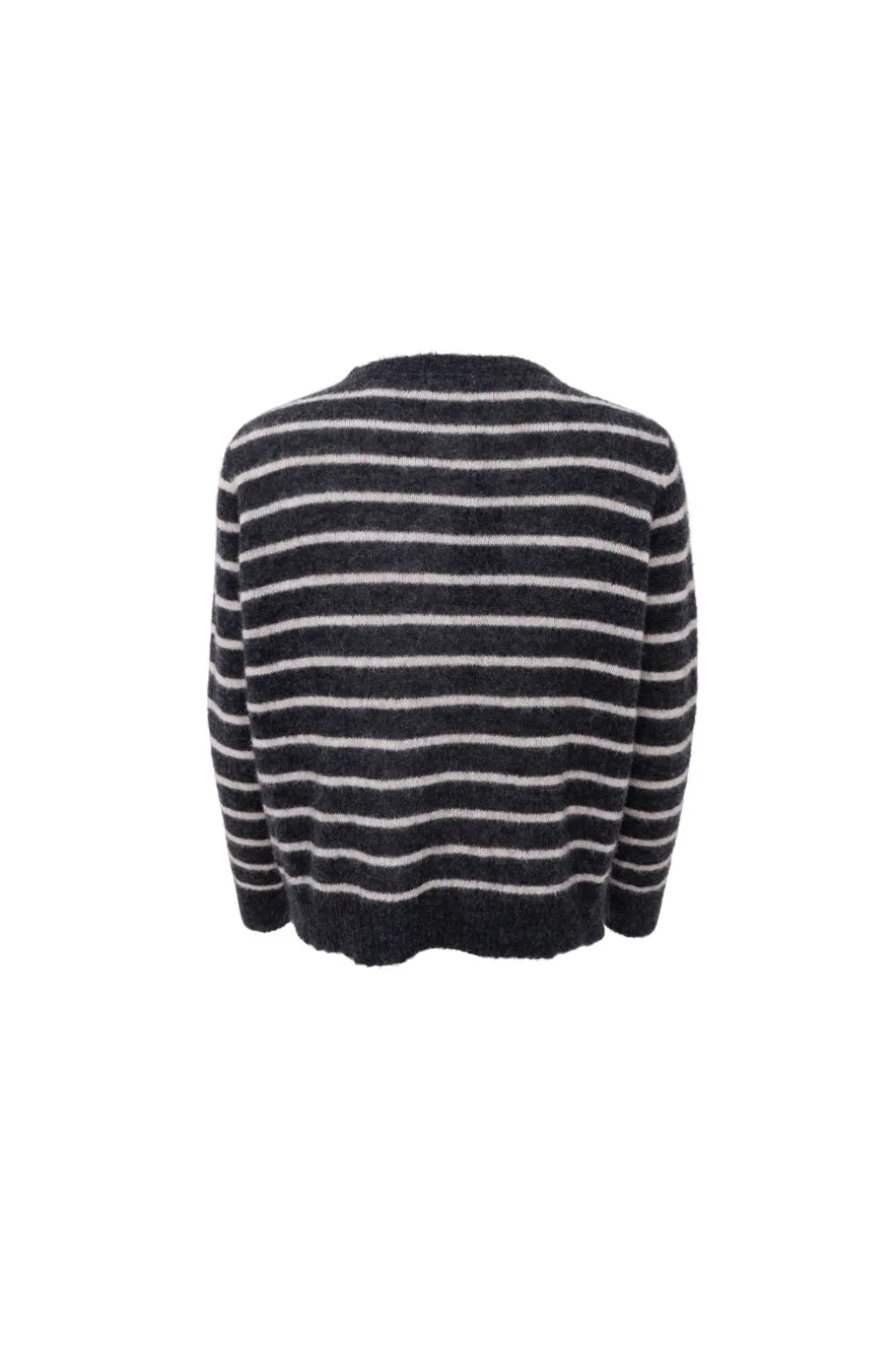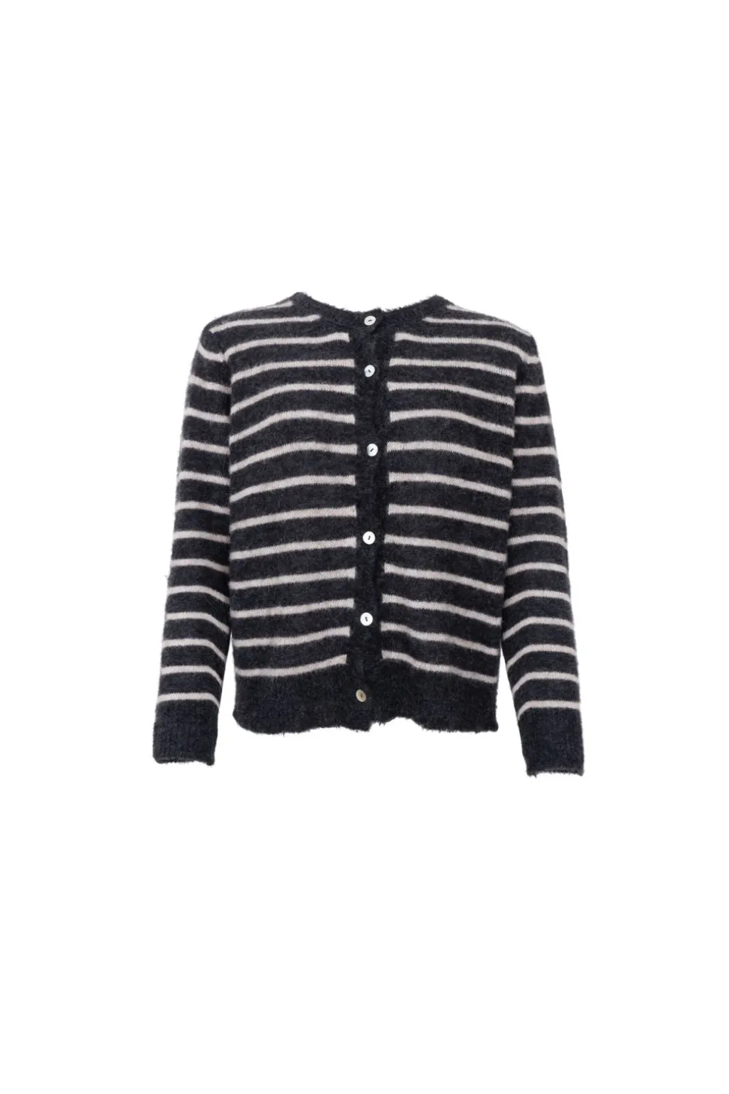 Mørkegrå strikket cardigan fra Black Colour med beige striber. Cardiganen har en rund halsudskæring og fine perledetaljer langs kanten.