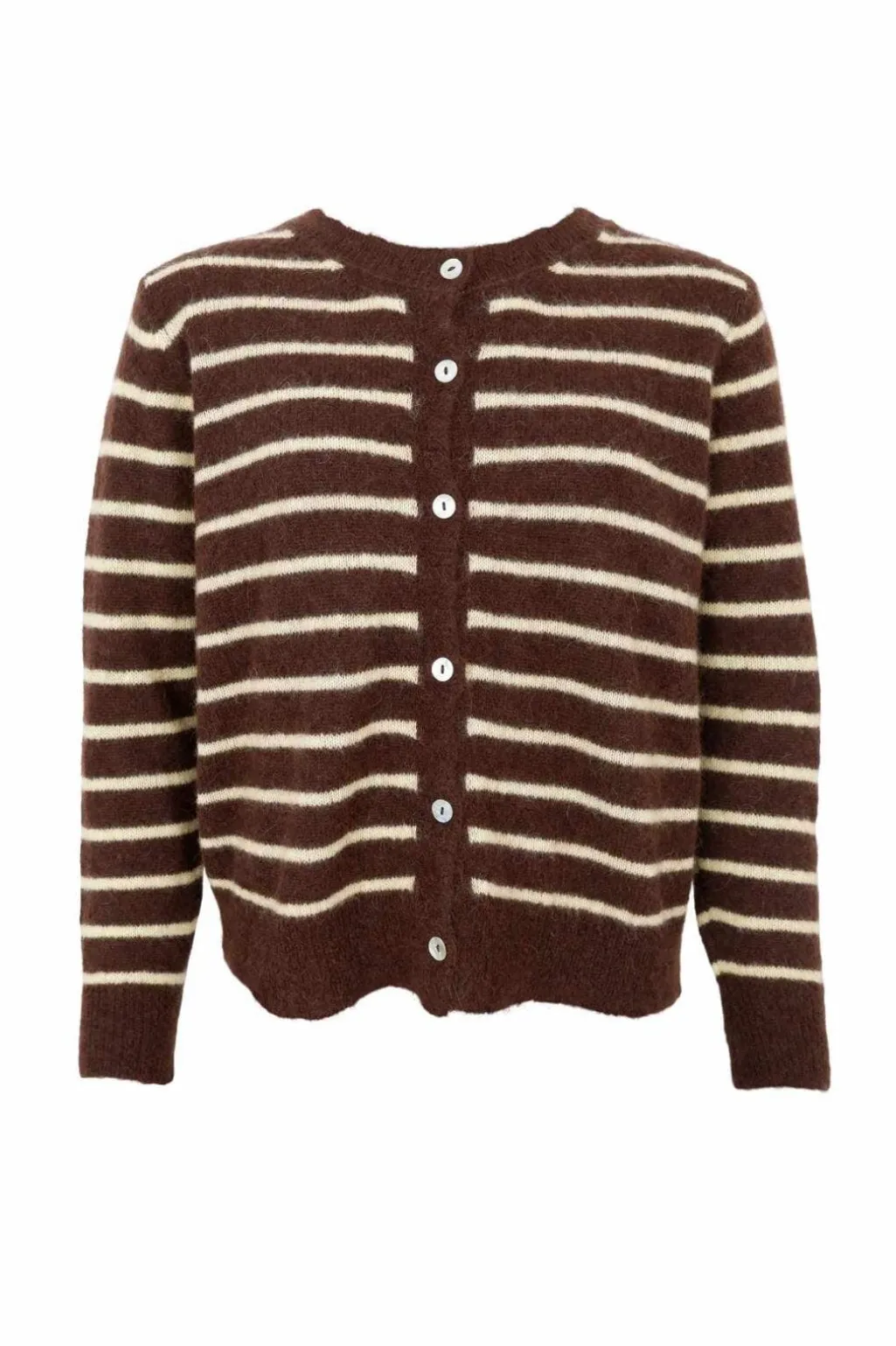 Stribet cardigan fra Black Colour i brun. Den har en knappelukning foran og lange ærmer med rund hals.