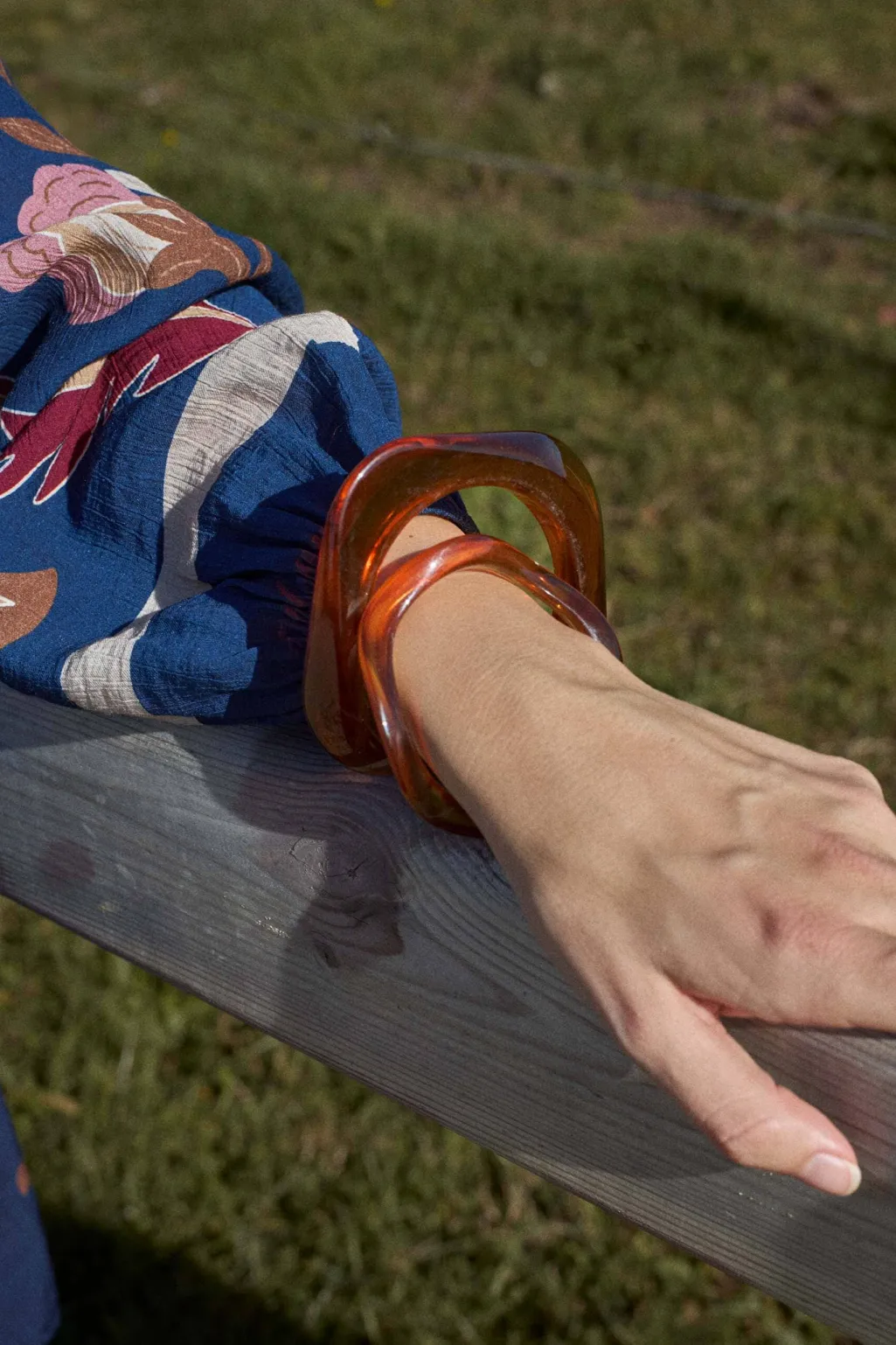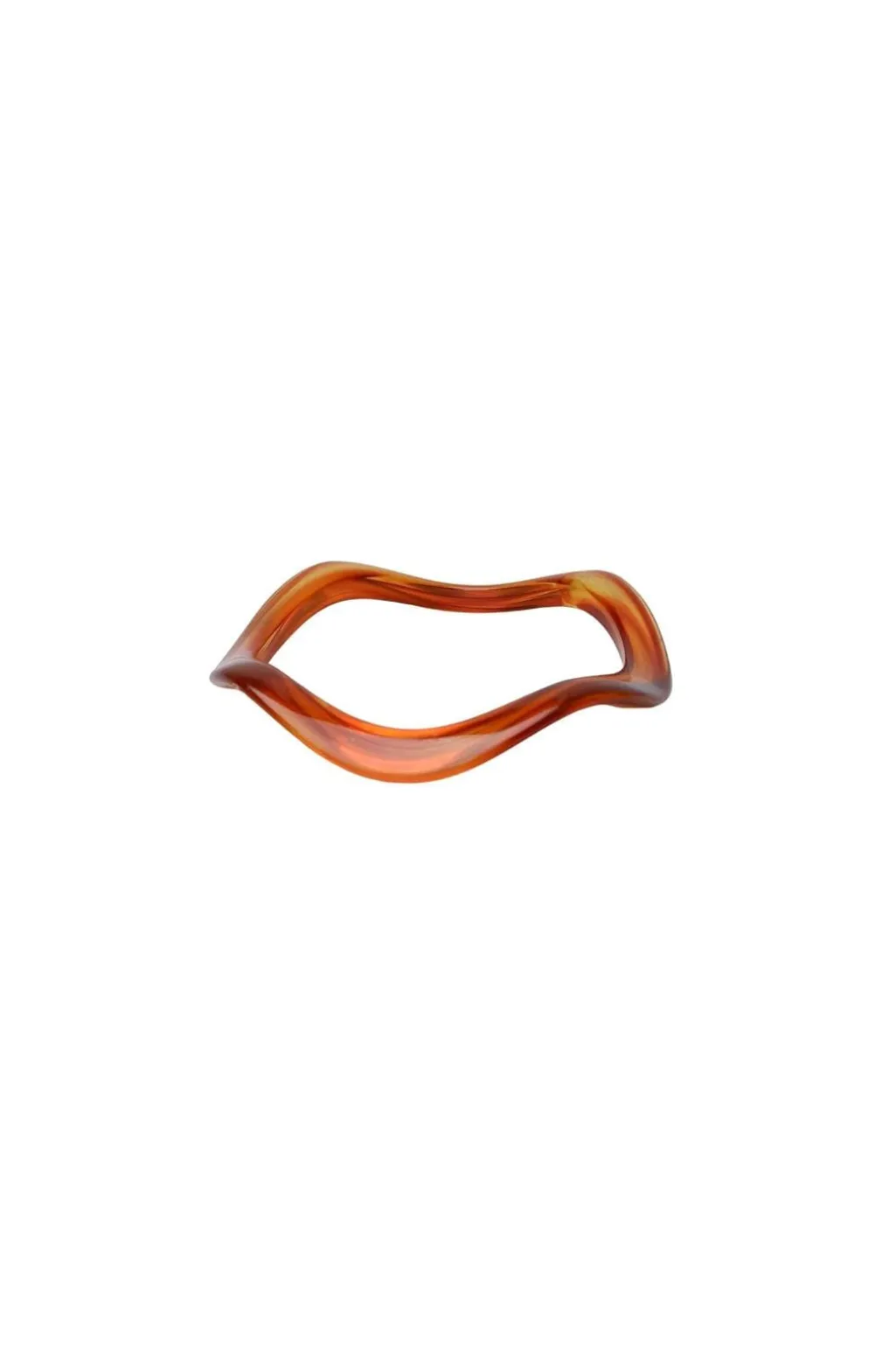 Armbånd fra Black Colour i ravfarvet akryl. Armbåndet har en organisk form med bølgede kanter og et bredt design.