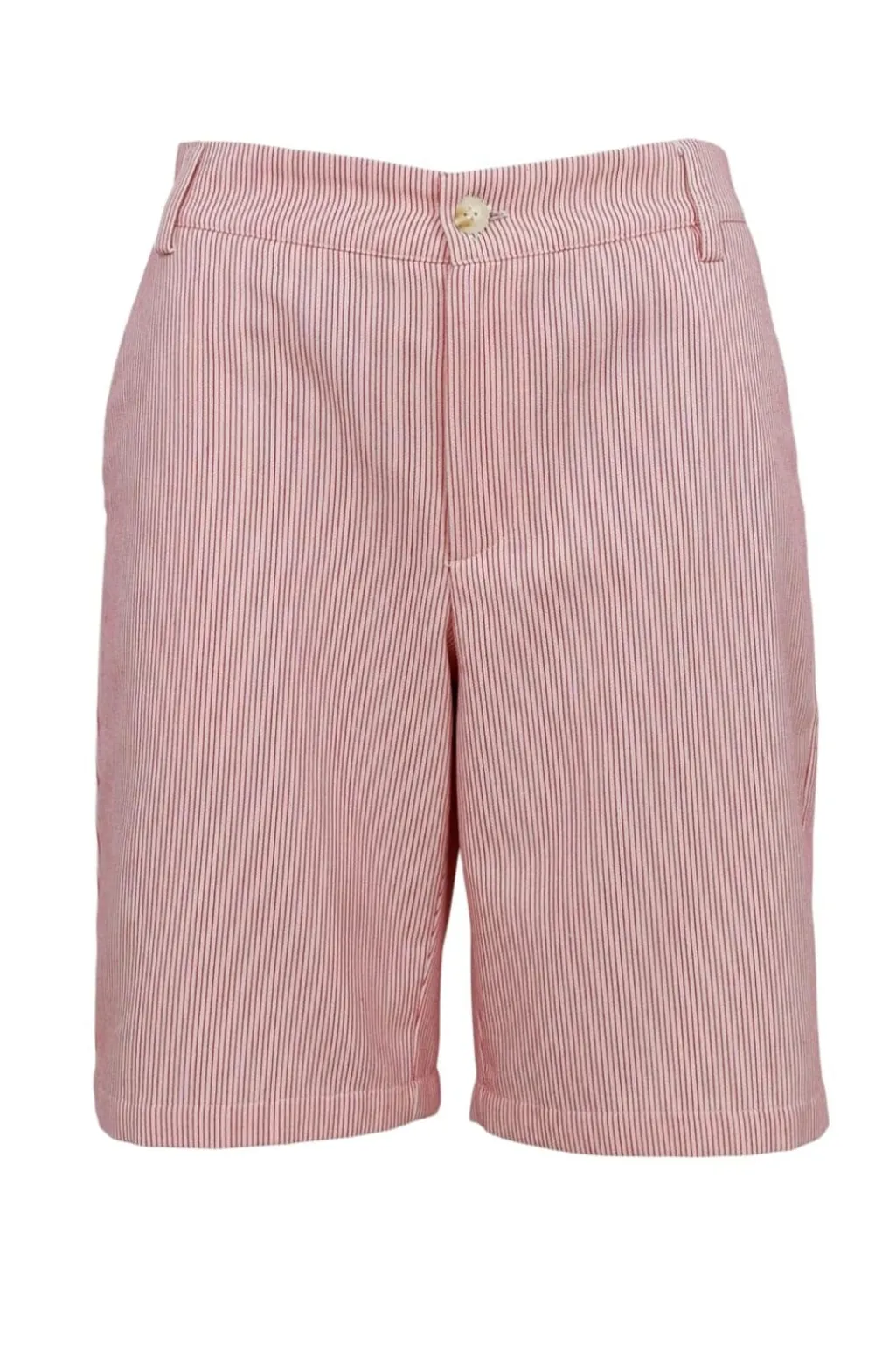 Stribede shorts fra Black Colour med pinstripe-mønster i hvid og rød. Shortsene har knælængde og kombinerer et maritimt udtryk med praktiske detaljer som elastik og knapper i taljen.