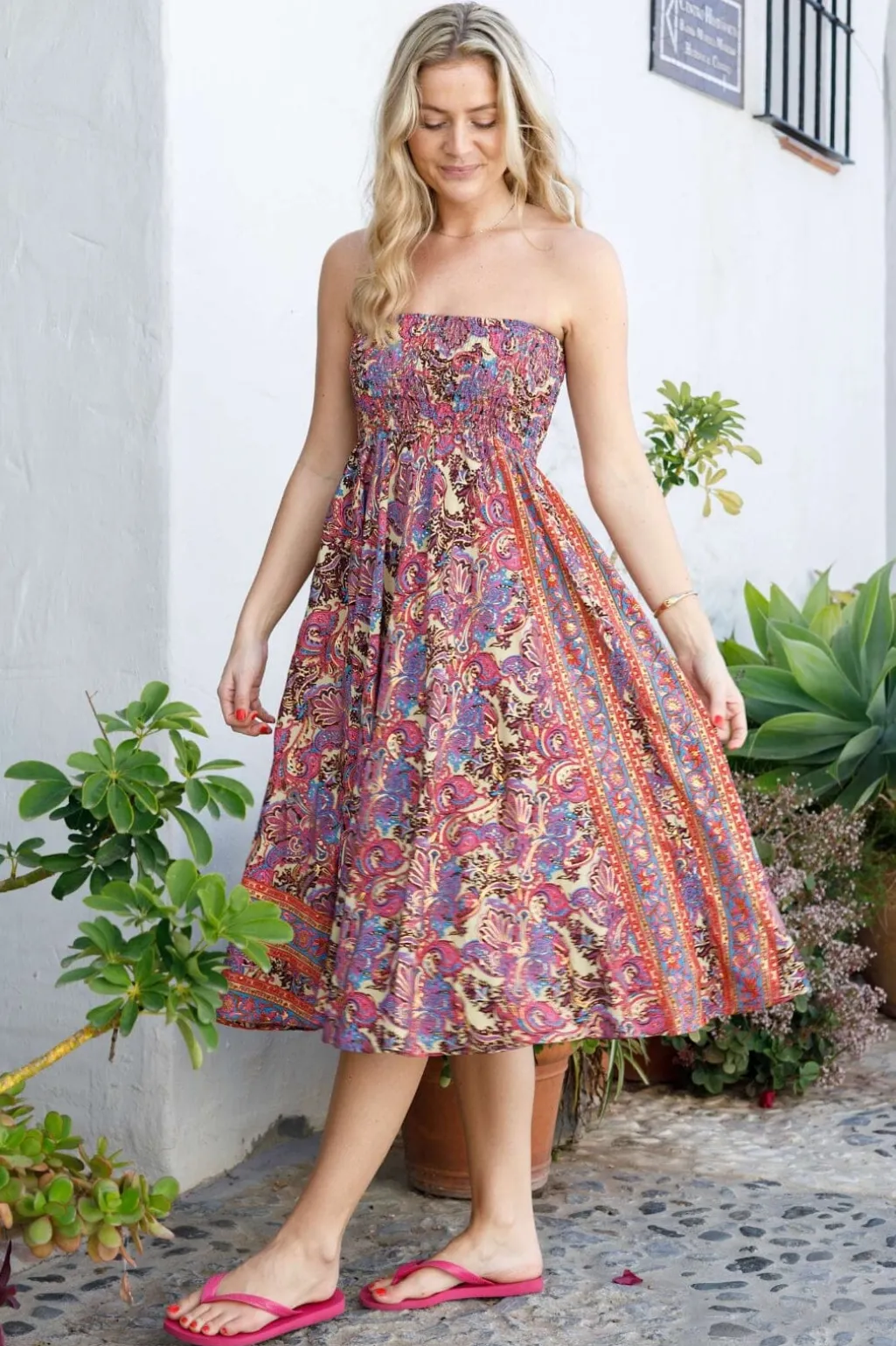 Nederdel fra Black Colour i Royal Berry med multifarvet mønster. Den lange nederdel har smockdetaljer og flæser, som skaber en fin silhuet fra talje til læg.