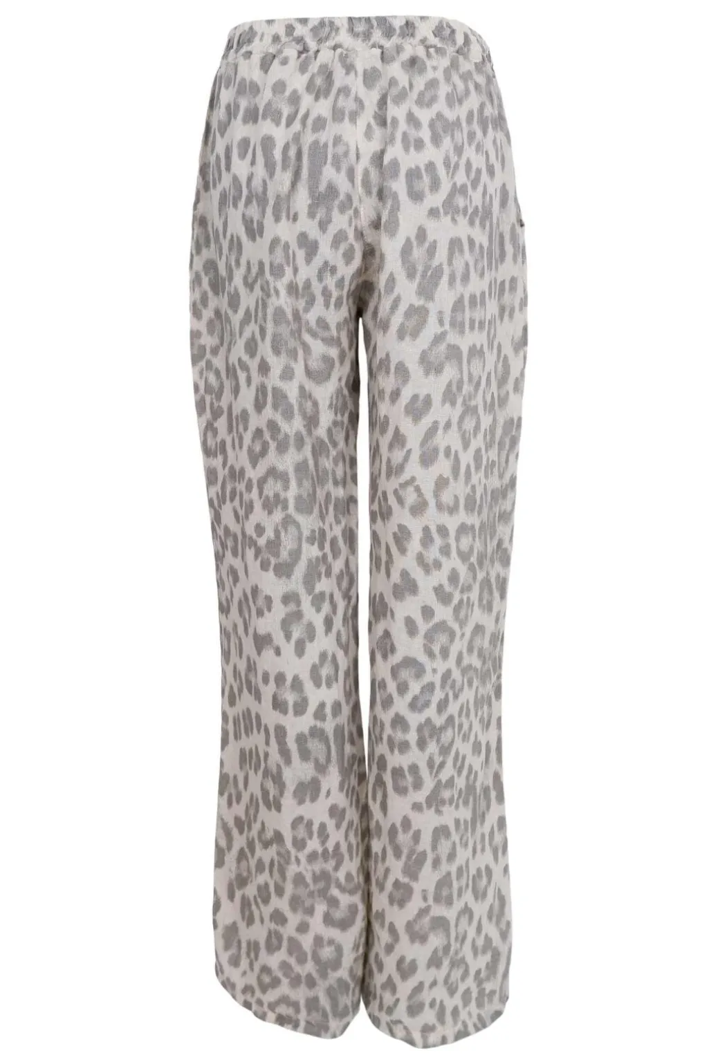 Brede bukser fra Black Colour i let hørmateriale. Bukserne har et naturligt leopardmønster i beige og grå nuancer samt en afslappet pasform med brede ben.