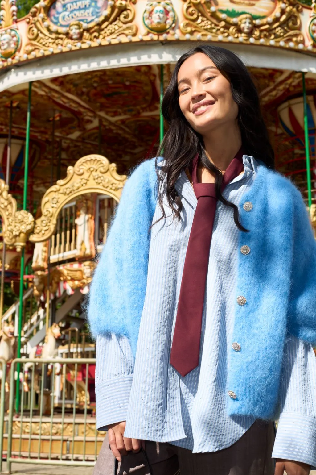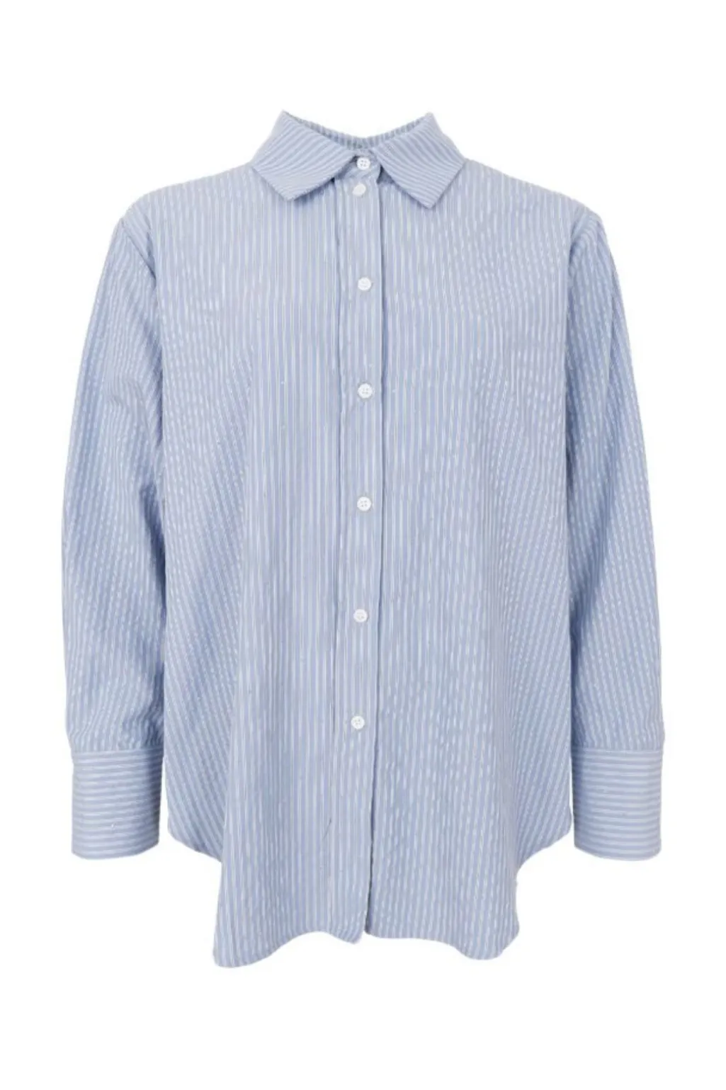 Stribet skjorte fra Black Colour i lyseblå. Skjorten har pailletter som detalje og en oversized pasform med klassisk skjortekrave og knapper hele vejen ned.