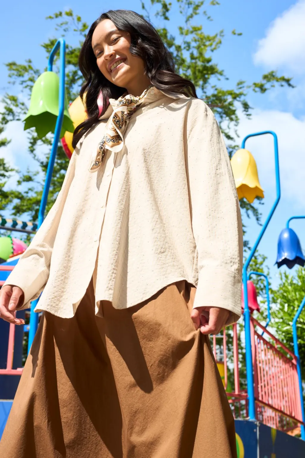 Cremefarvet skjorte fra Black Colour med pinstripe-mønster og pailletter. Skjorten har en løs pasform og lange ærmer med klassisk skjortekrave og knaplukning.