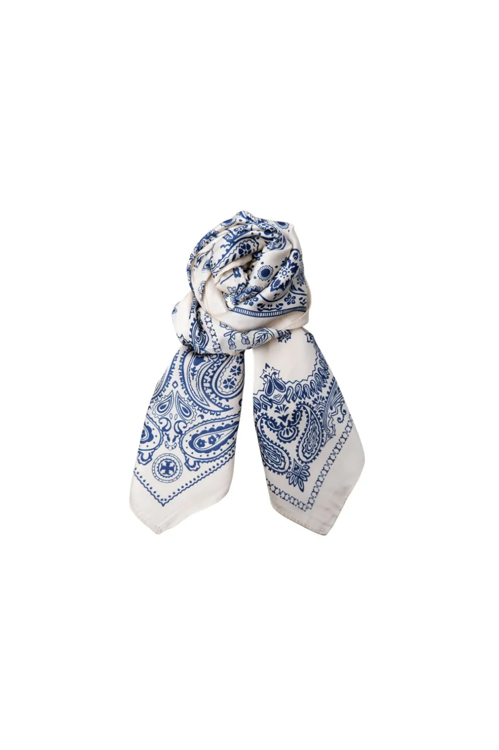 Mini tørklæde fra Black Colour, lavet af polyester i en beige nuance. Det symmetriske mønster kombinerer blå og hvid i paisley-elementer med blomsterdetaljer.