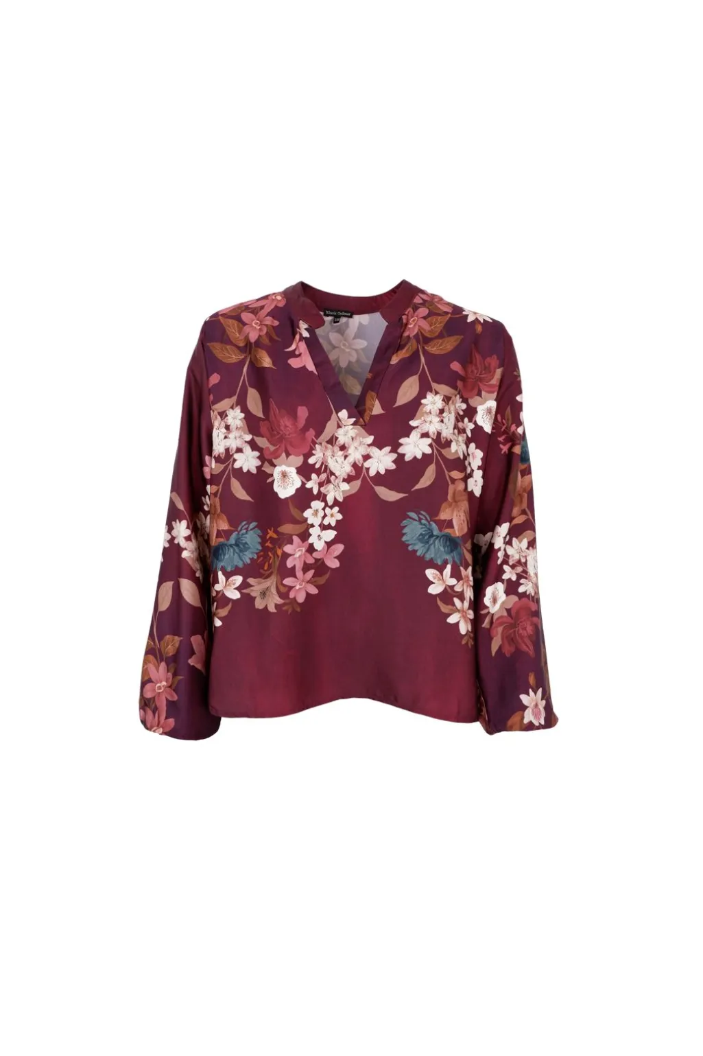 Bordeauxfarvet bluse fra Black Colour med blomsterprint i rosa og hvide nuancer. Blusen har V-udskæring, lange ærmer og flæsedetaljer, der giver et feminint udtryk.