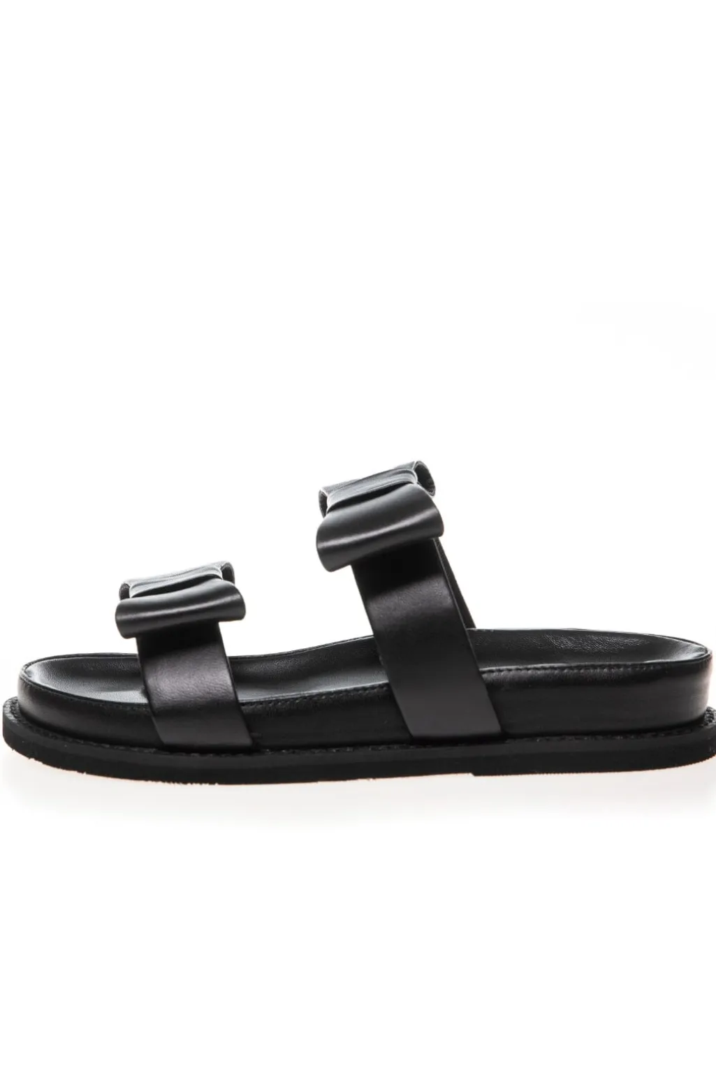 Sort lædersandal med to brede bånd formet som sløjfer på oversiden. Sandalen har en flad sål og er fremstillet i blødt læder, der former sig efter foden.