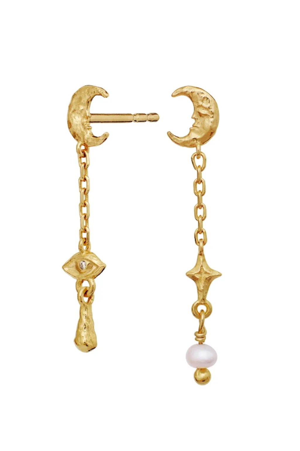 Øreringe fra Maanesten med et design af halvmåner, en ferskvandsperle og et øje-motiv. De gyldne øreringe kombinerer symbolske elementer i en hængende kæde.