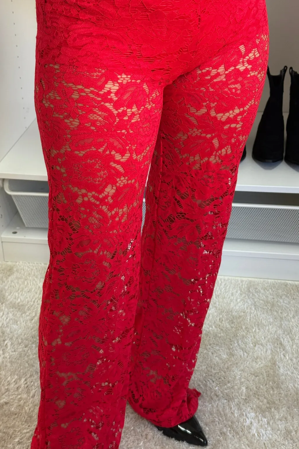 Røde bukser fra A-bee med blomsterblonde i et gennemsigtigt materiale. Bukserne har høj talje og går helt ned til gulvet.