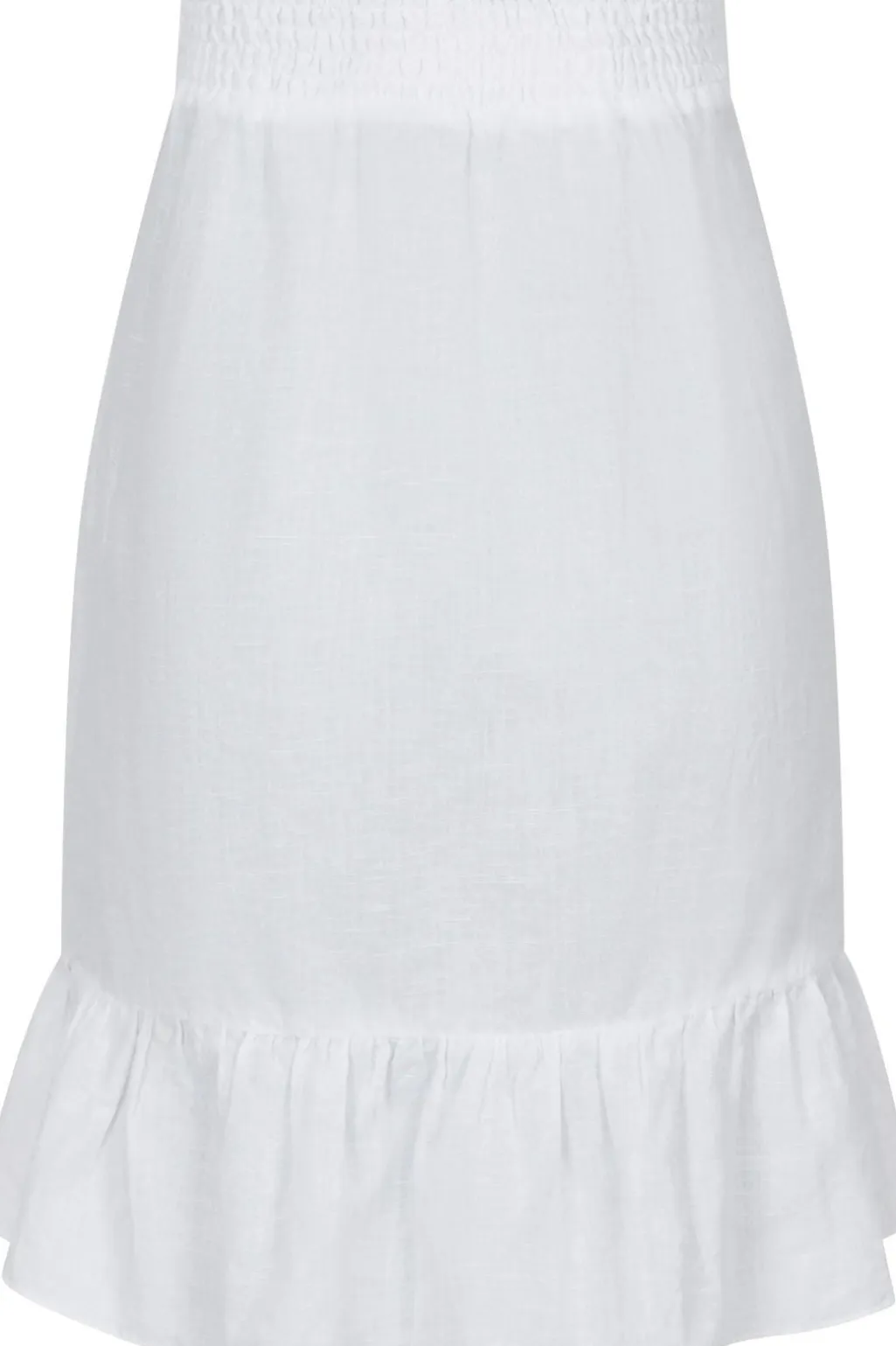 Hvid hørnederdel med flæsekant forneden. En kort model med rynket elastik i taljen bagpå. Nederdelen er lavet af en blanding af bomuld og hør.