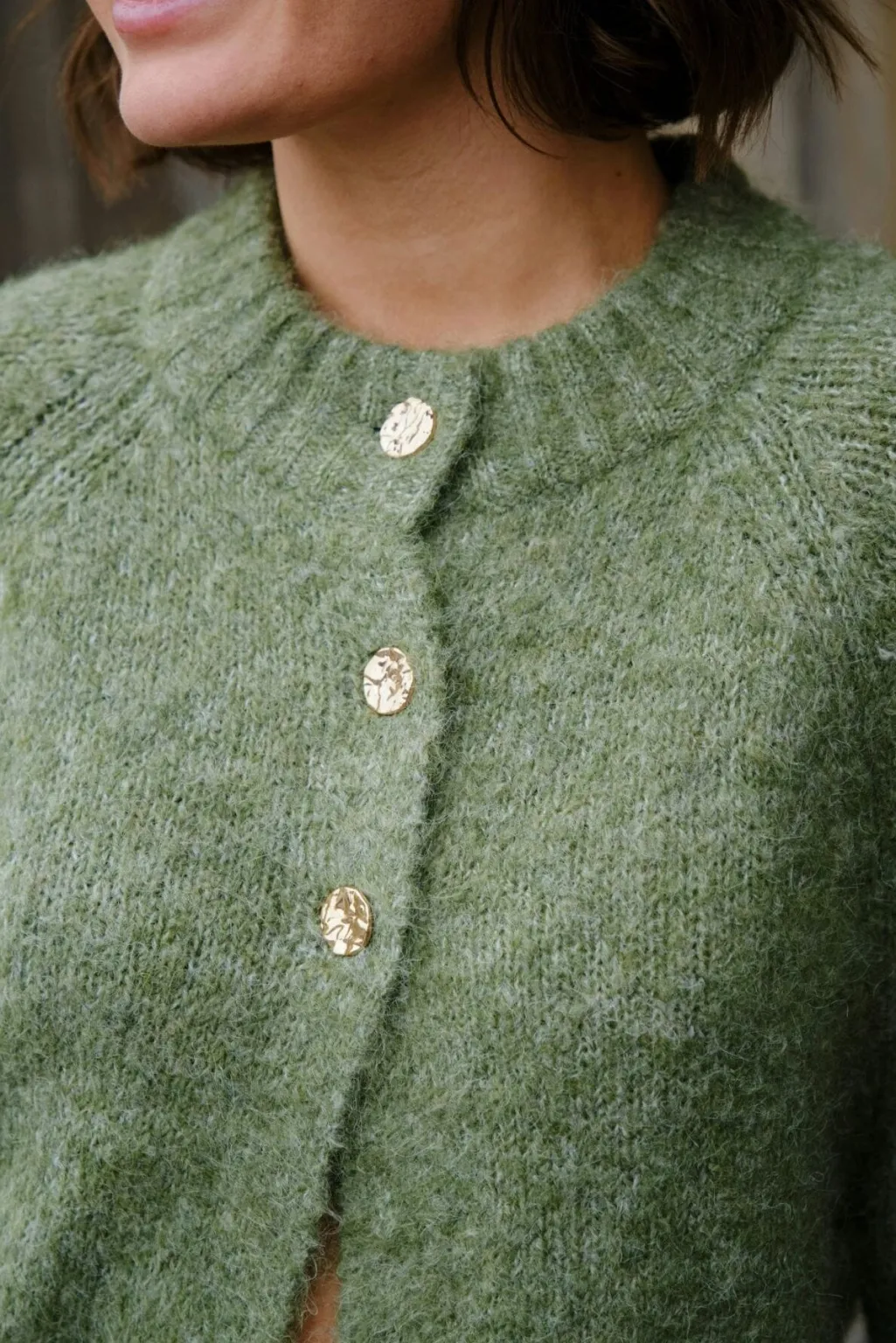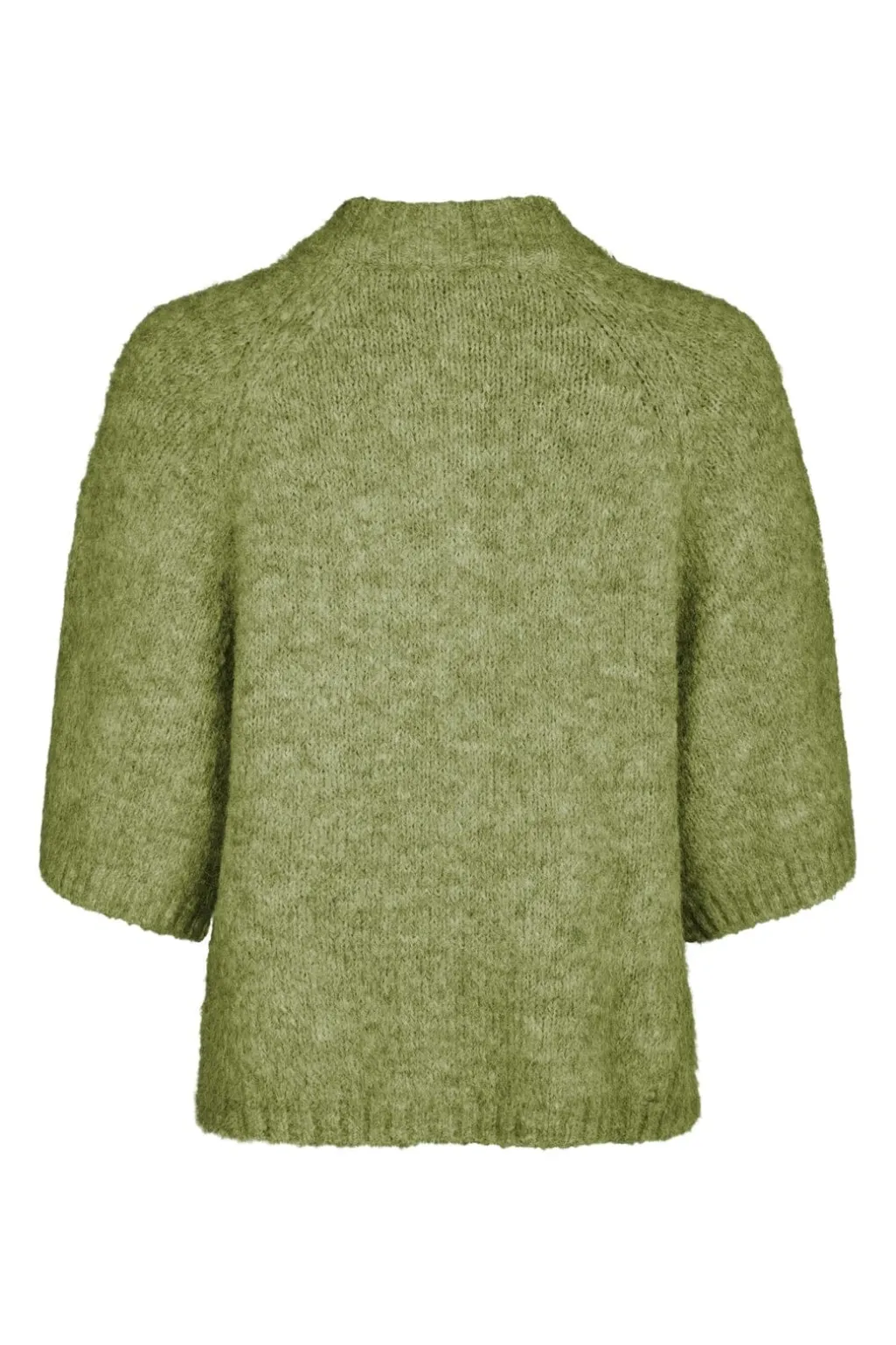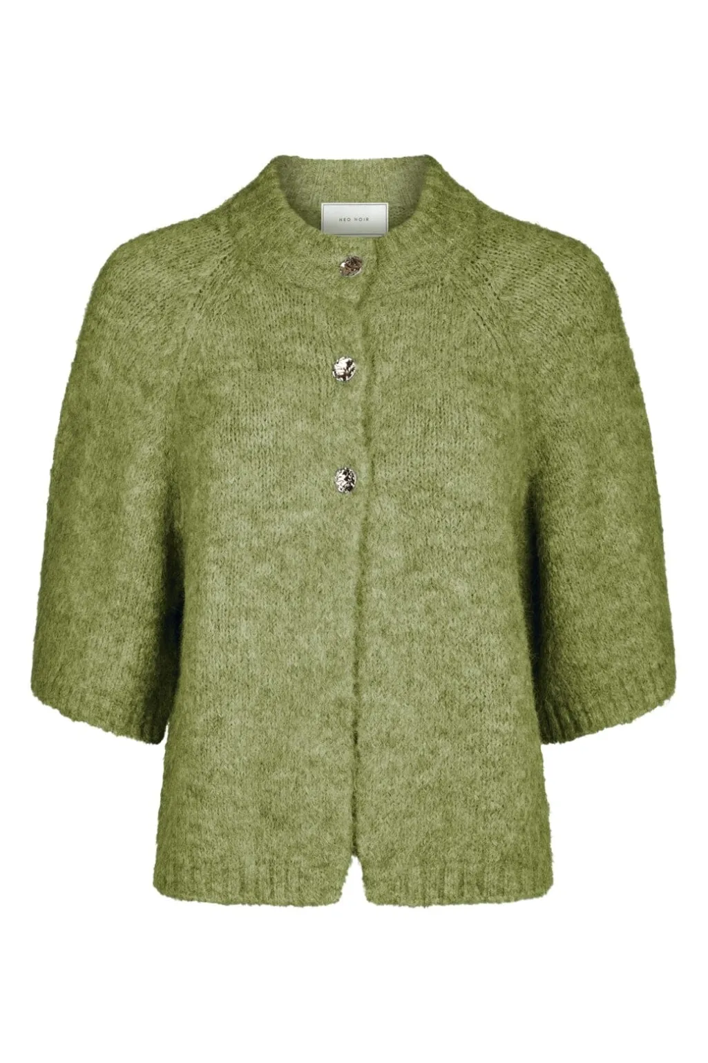 Støvet grøn cardigan fra Neo Noir med fluffy striktekstur. Den har en løs pasform med 3/4 ærmer og rund hals. Cardiganen lukkes med dekorative knapper foran.