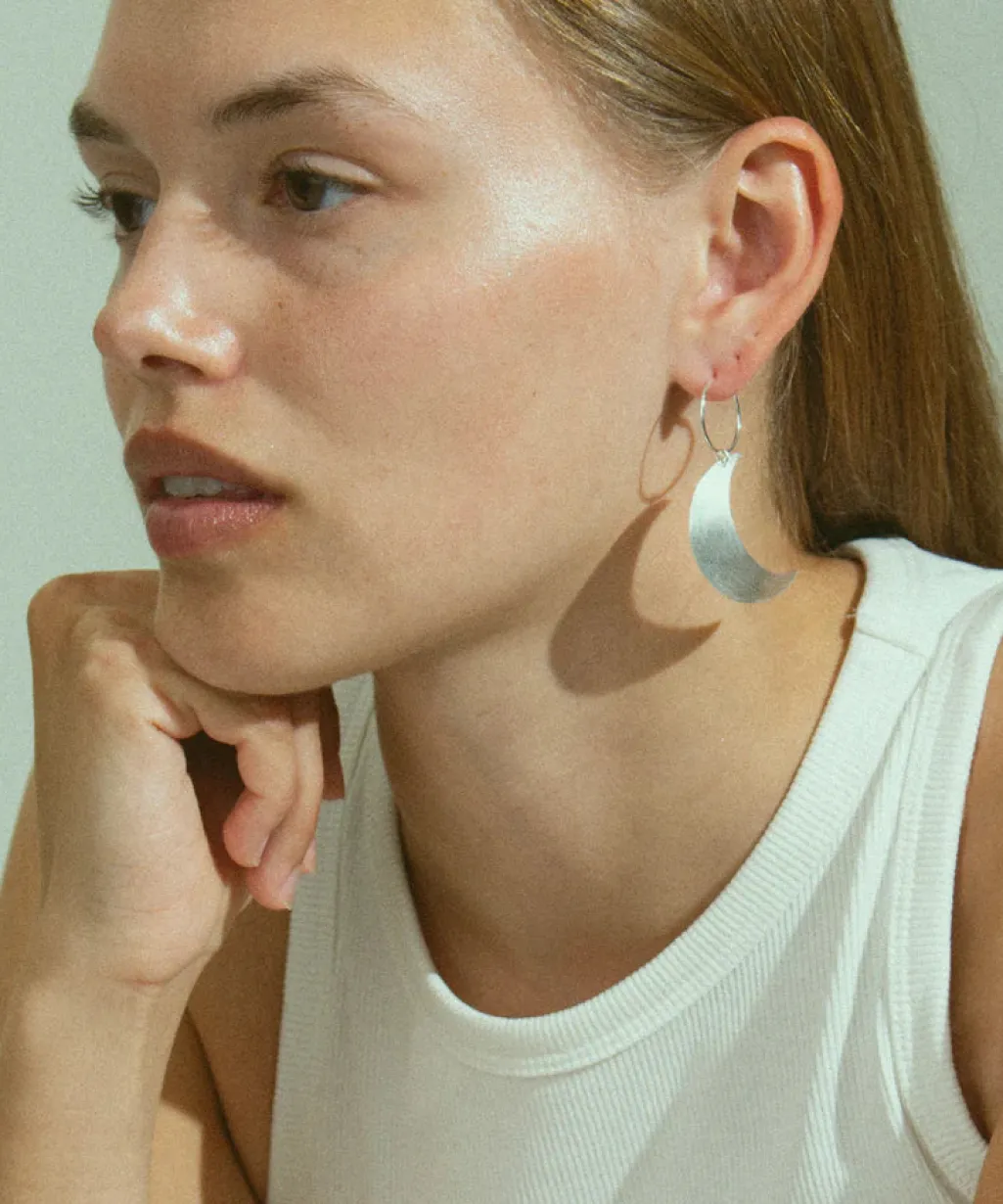Sølvcreoleørering fra Jane Kønig med halvmåneform. Den glatte overflade og det buede design giver øreringen et rent og minimalistisk udtryk.