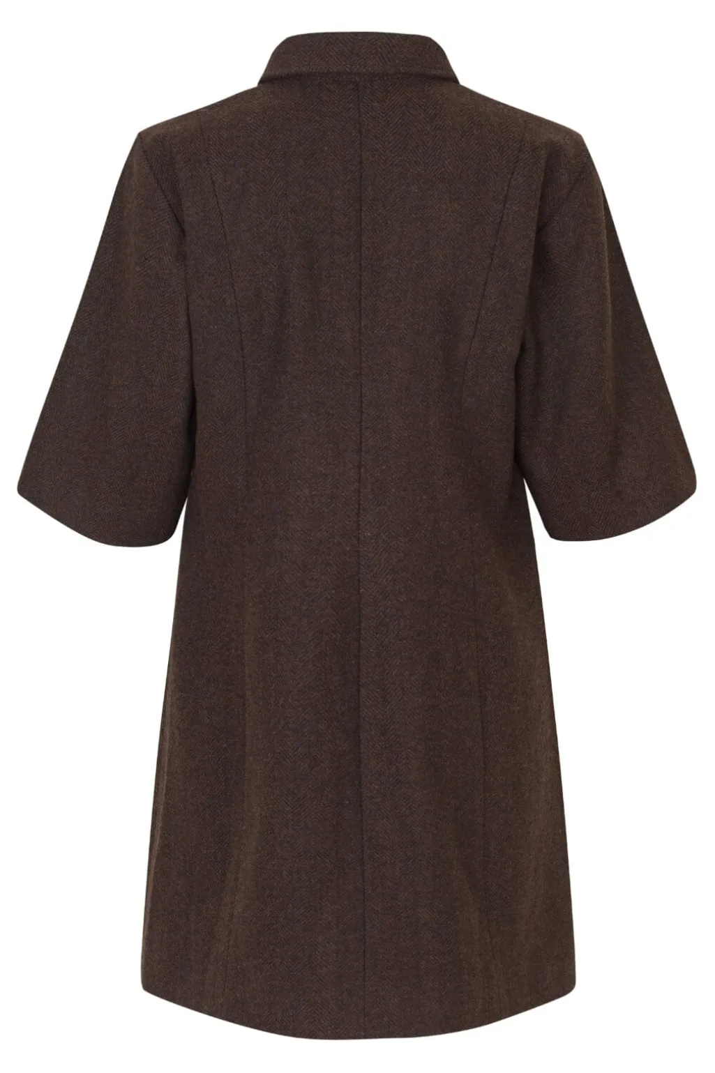 Skjortekjole fra MbyM i brun-sort twill med herringbone-mønster. Den har korte ærmer, klassisk krave og knapper foran.