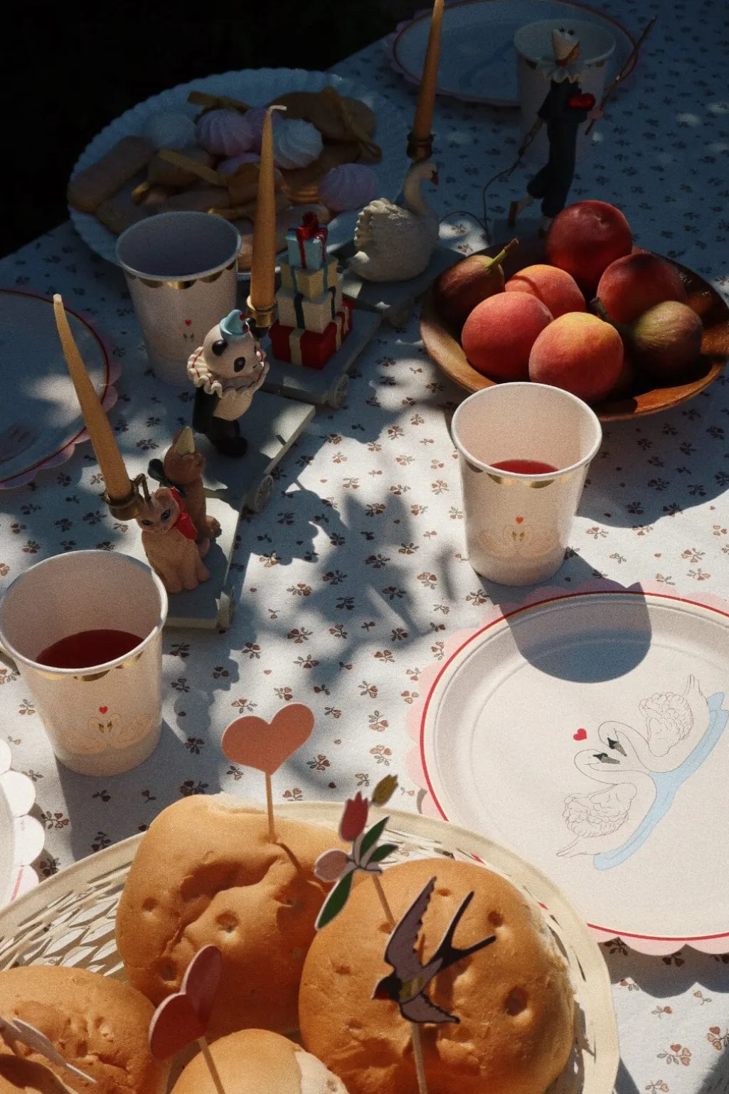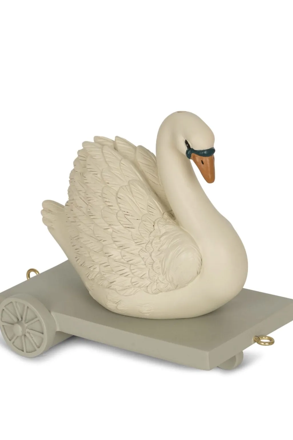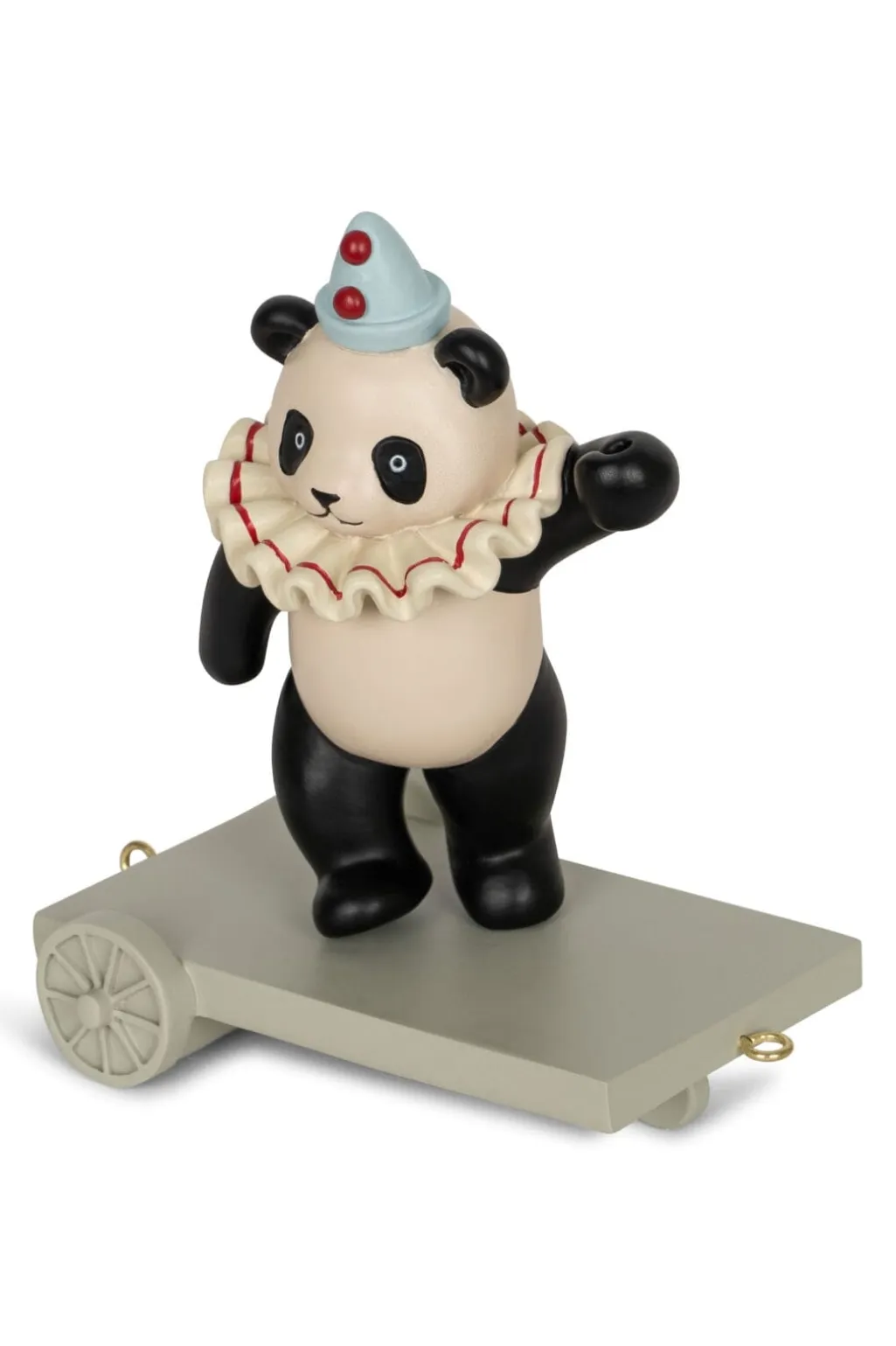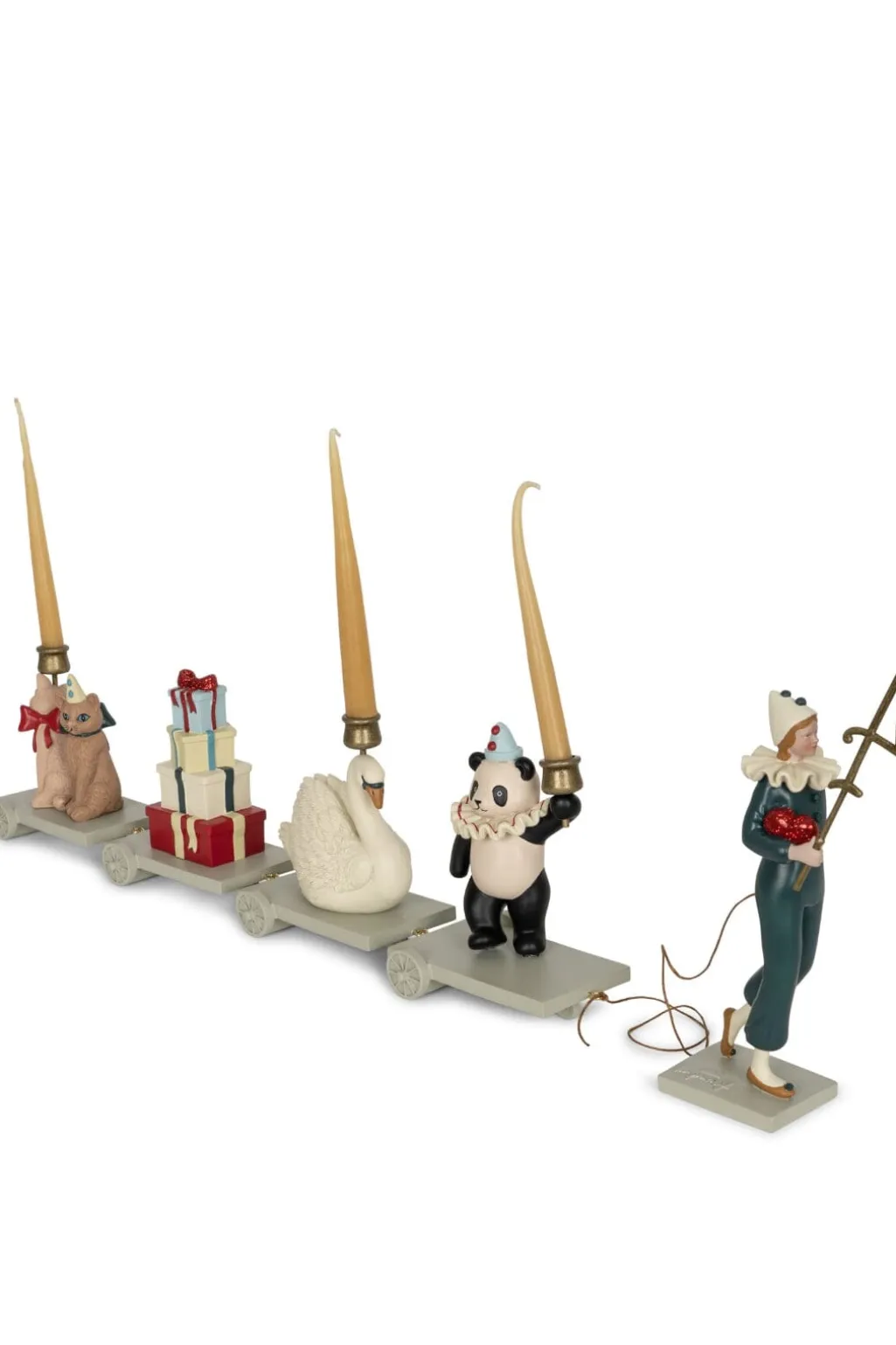 Et dekorativt fødselsdagstog fra Konges Sløjd med figurer som kat, svane, panda og klovn. Toget har lysestager i metal og er CE-mærket til sikker brug omkring børn.