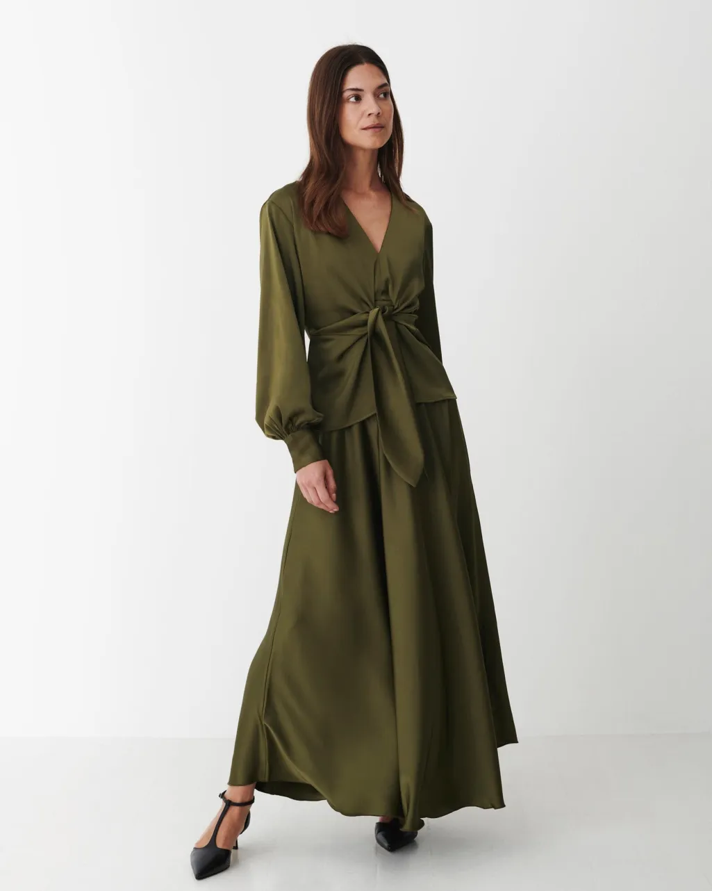 Olivengrøn bluse fra Karmamia med V-hals og knudedetalje foran. Blusen har lange ærmer med pufeffekt ved håndleddene og et blankt, glat stof.