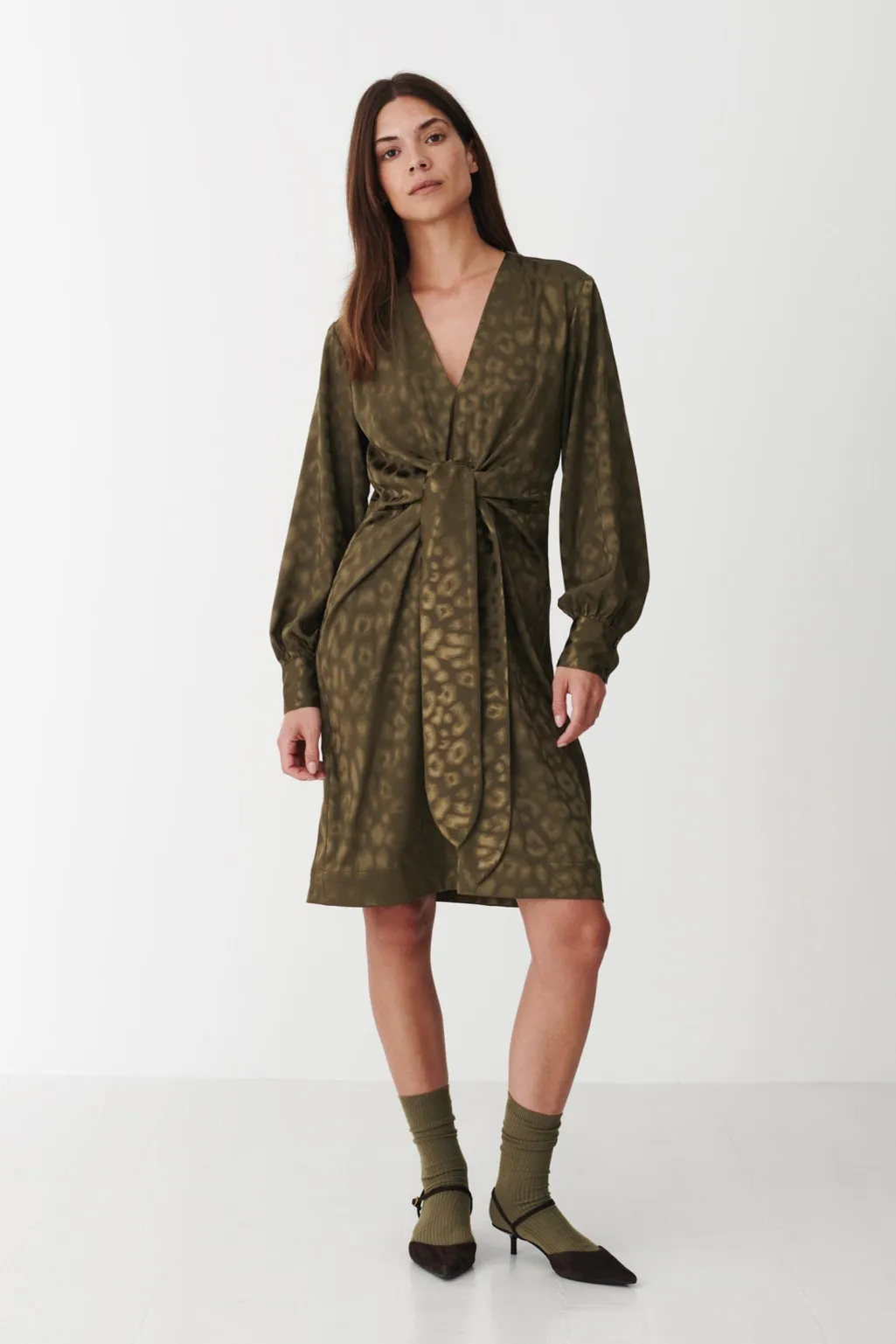 Knælang kjole i armygrøn med leopardmønster. Den har en V-udskæring, lange ærmer og et bånd i taljen. Kjolen kan styles til både hverdag og fest.