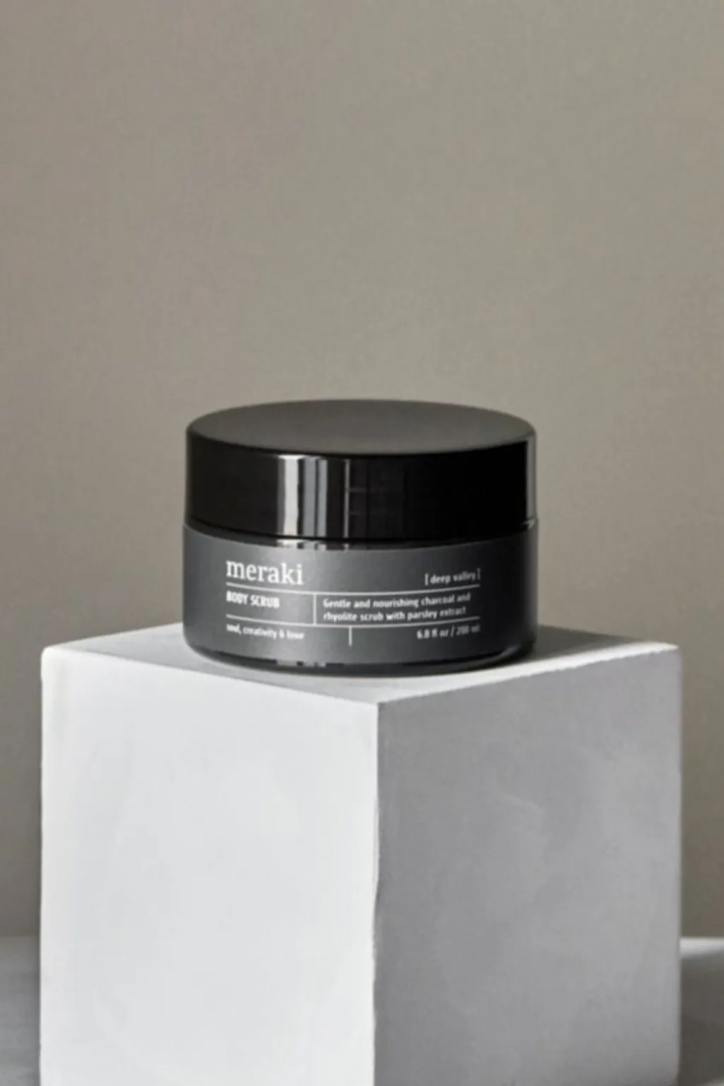 Kropsskrub fra Meraki med kulpulver og rhyolit, der eksfolierer huden blidt. Indeholder 200 ml og har en cremet konsistens med små partikler.