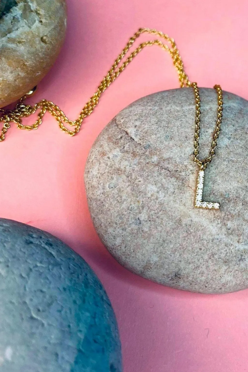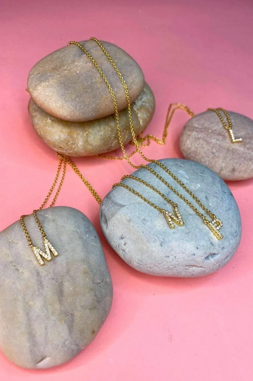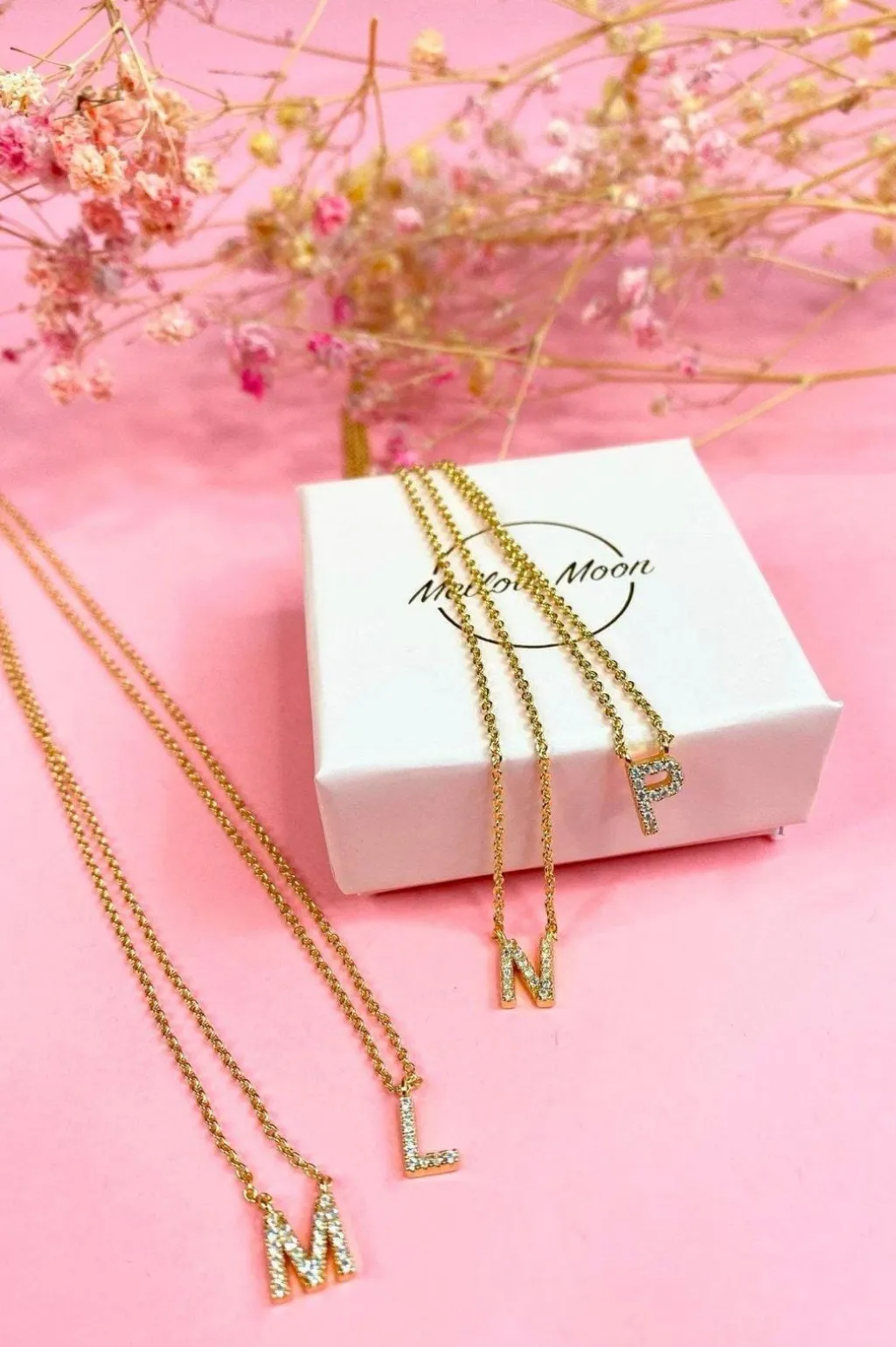 Bogstavhalskæde fra Mellow Moon med små sten på bogstavet. Halskæden er fremstillet i forgyldt messing og kommer i en hvid æske med Mellow Moon-logo.