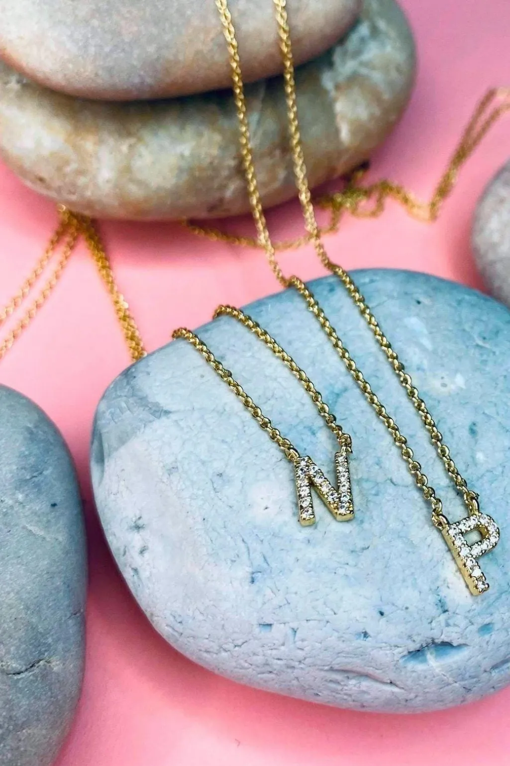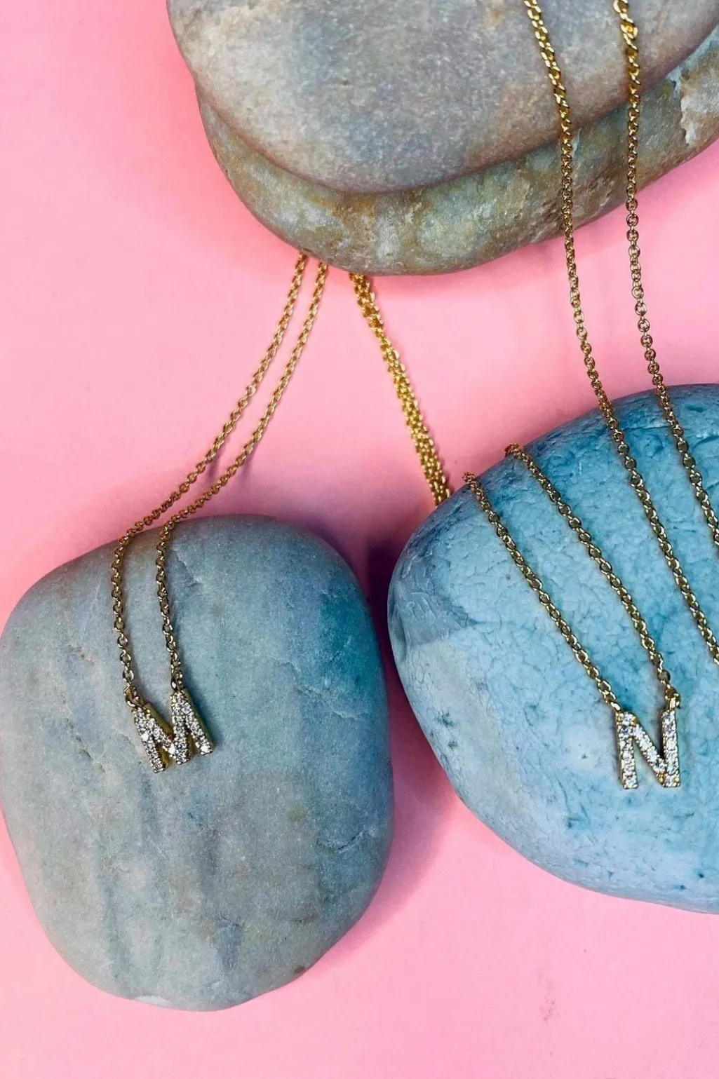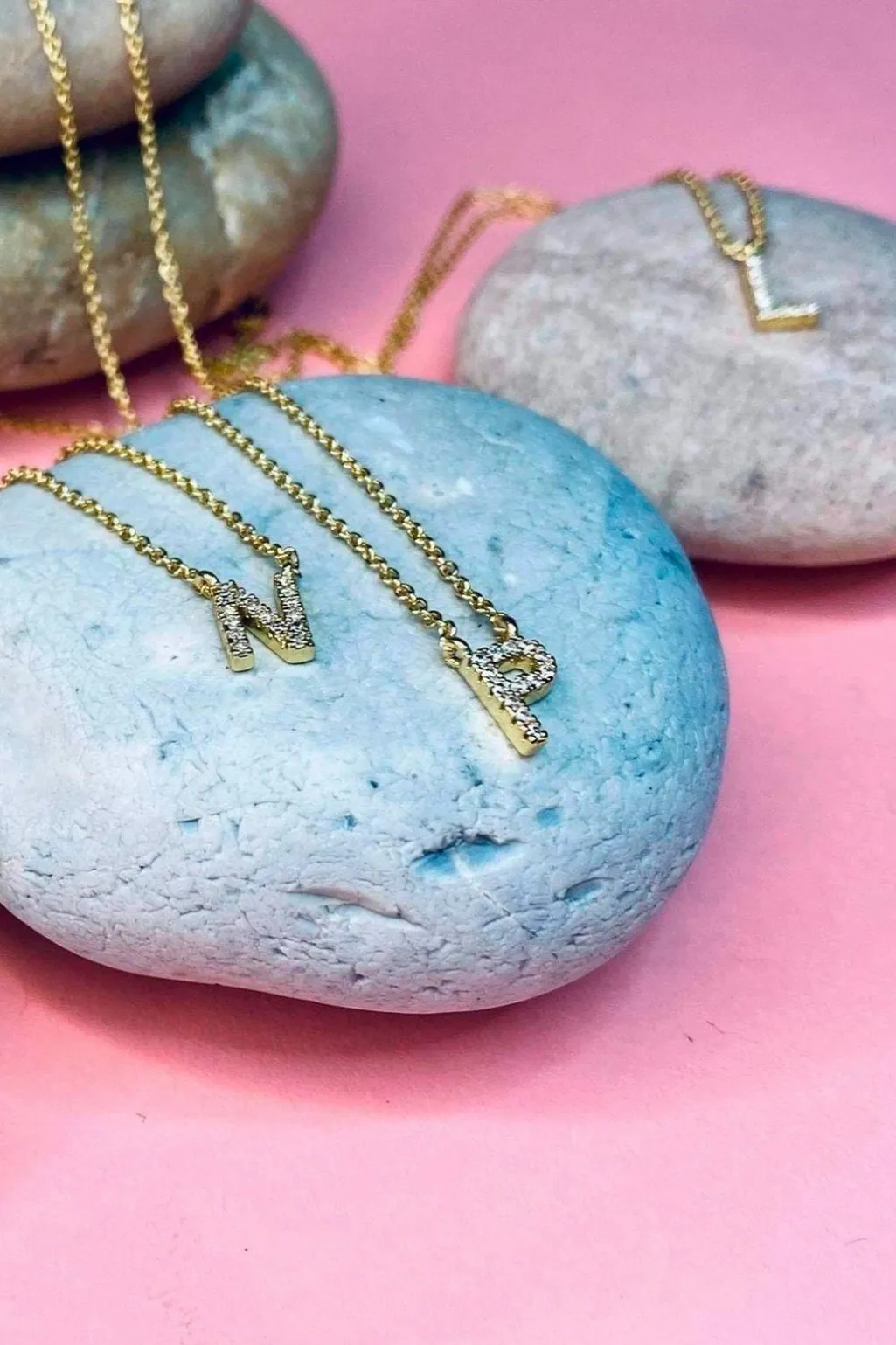 Bogstavhalskæde fra Mellow Moon med små sten på bogstavet. Halskæden er fremstillet i forgyldt messing og kommer i en hvid æske med Mellow Moon-logo.