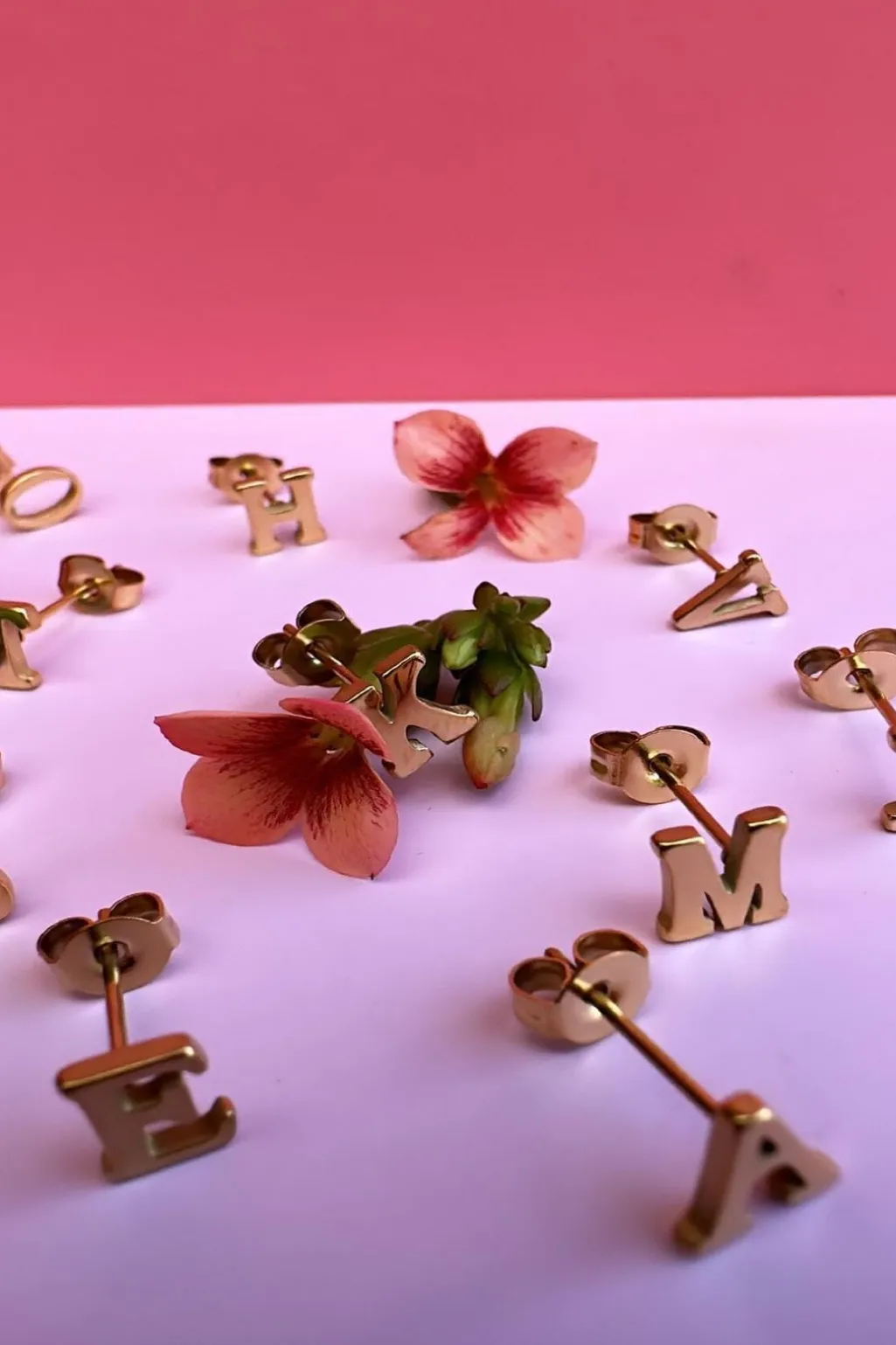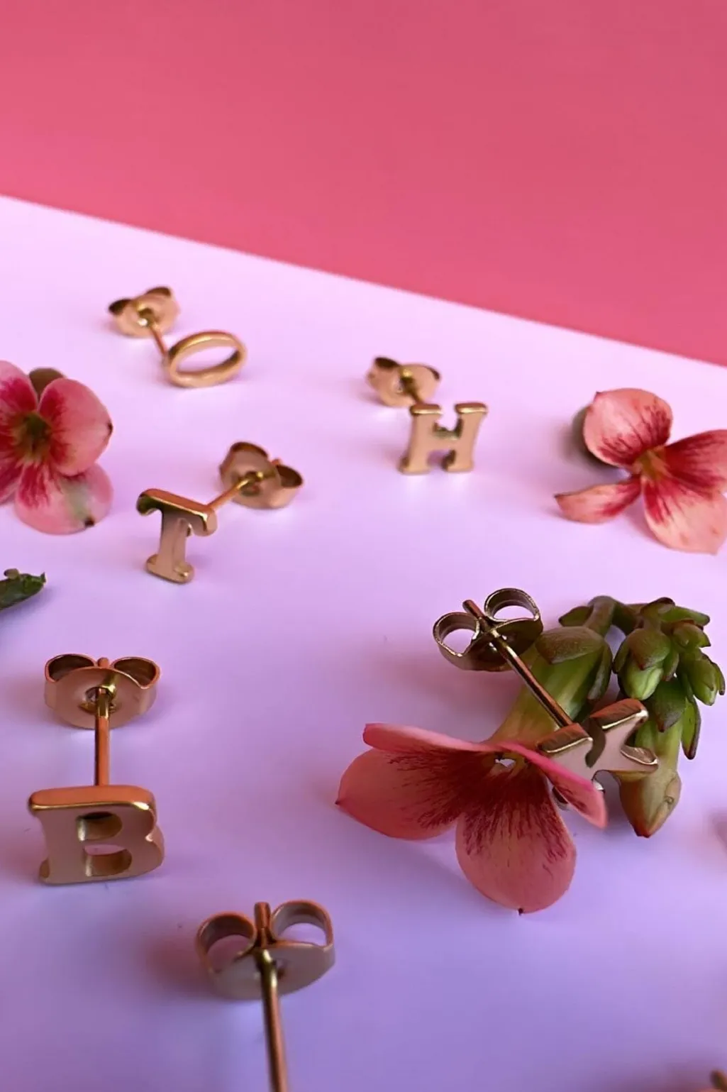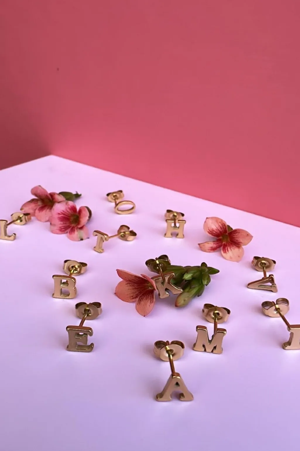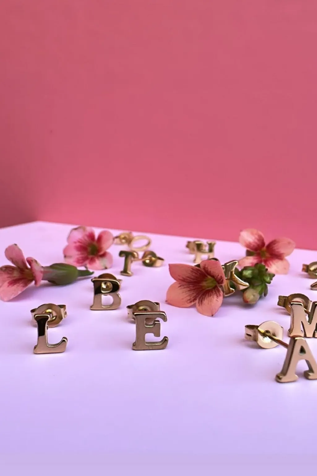 Bogstavsørestikker fra Mellow Moon i rustfrit stål med 18K guldbelægning. Ørestikkerne har form som enkelte bogstaver, der kan vælges efter ønske.