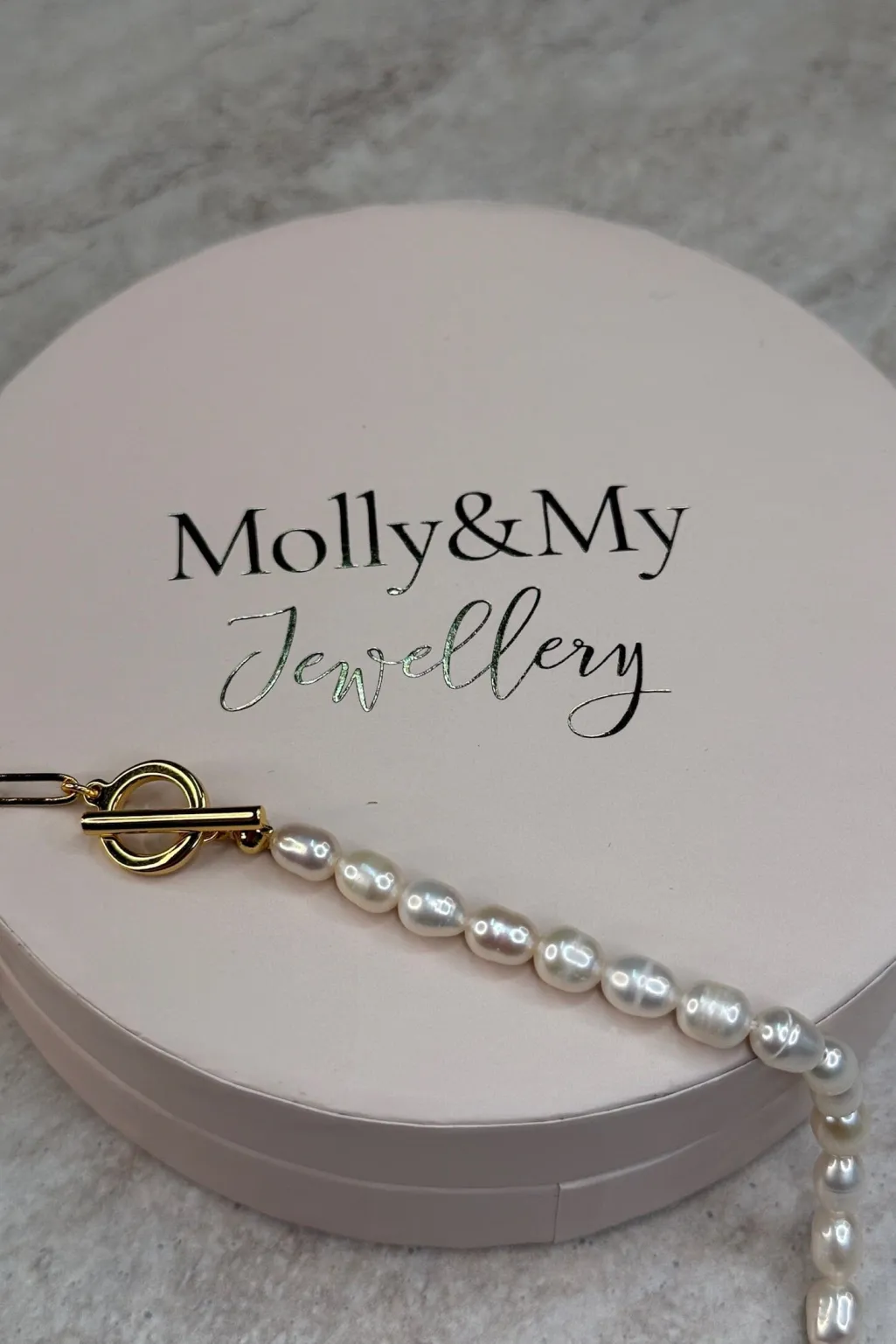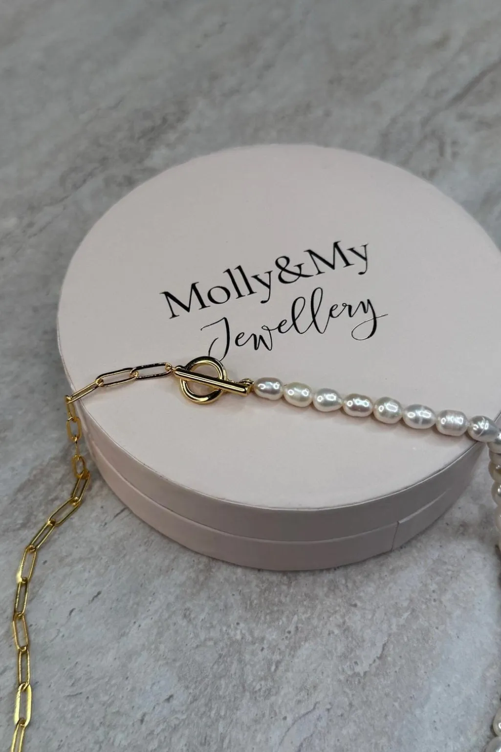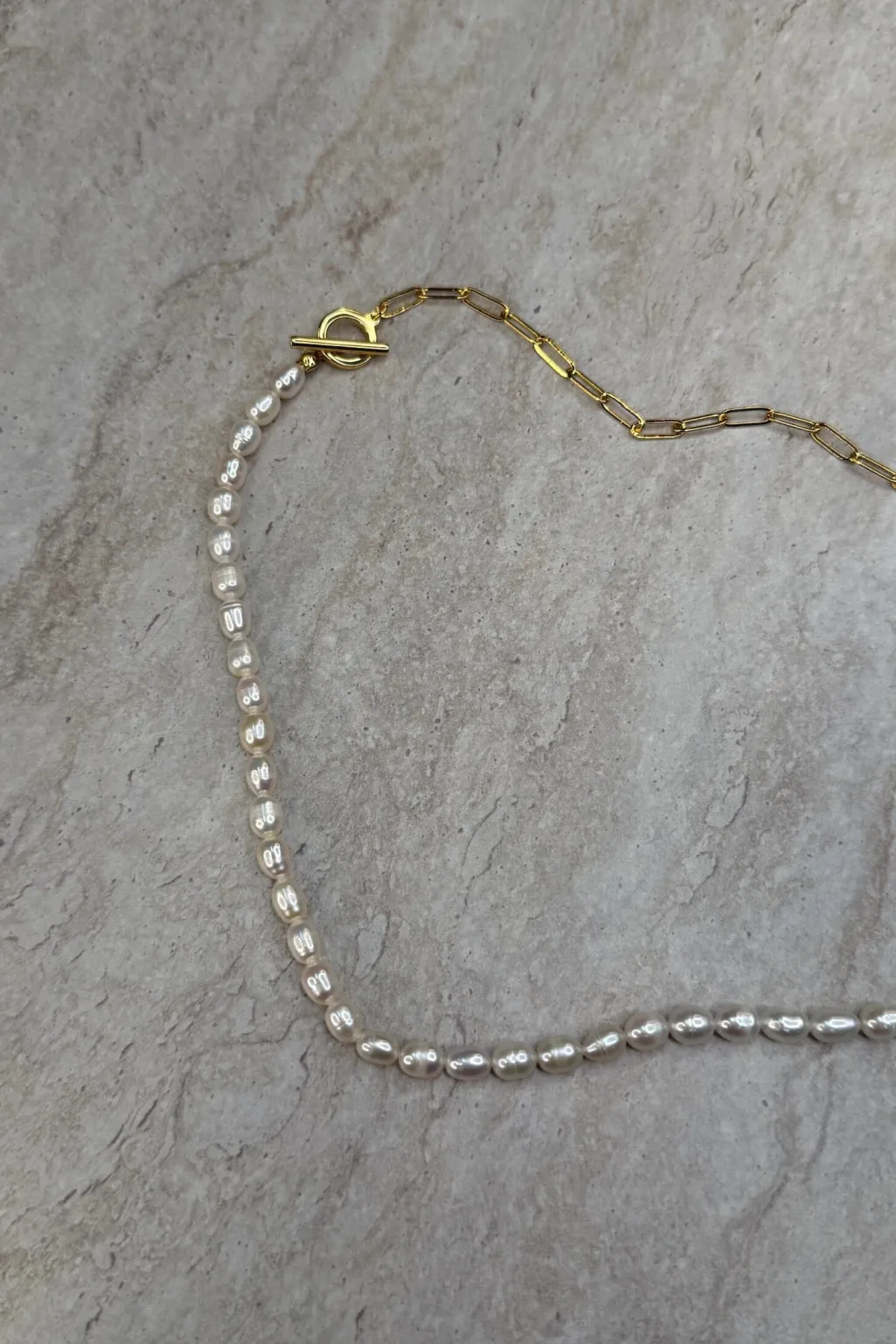 Halskæde fra Molly&My Jewellery med perler på den ene halvdel og en guldfarvet kæde med aflange led på den anden halvdel.