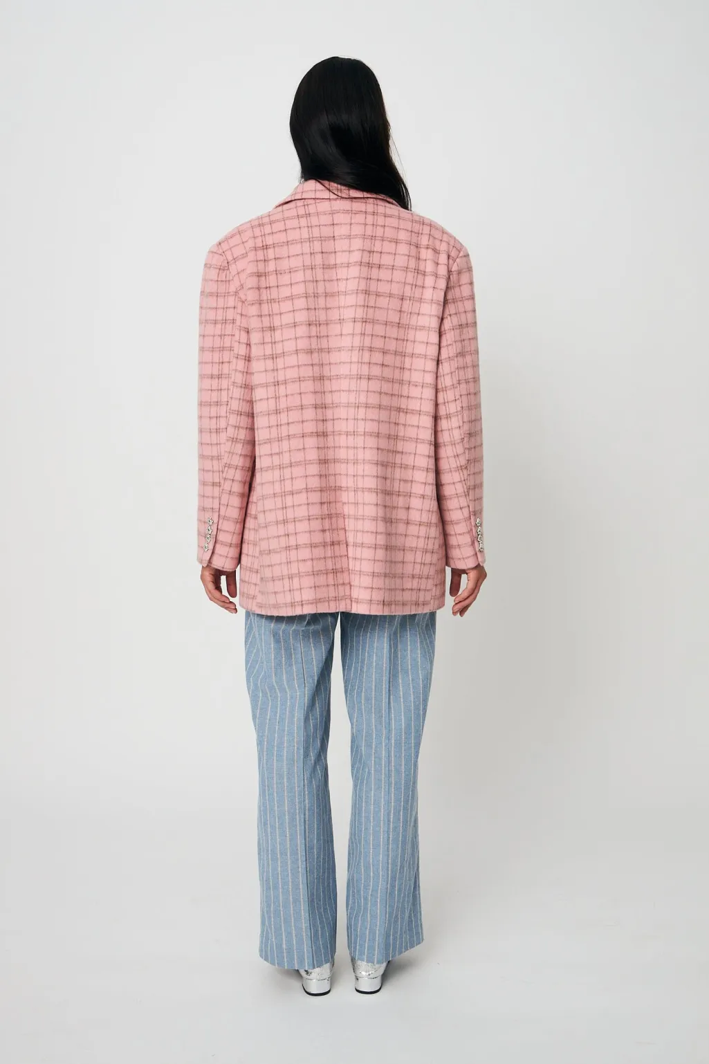 Pink ternet blazer fra Cras med skjortekrave og løs pasform. Blazeren har lange ærmer og pailletter, der giver et festligt præg til det ternede design.