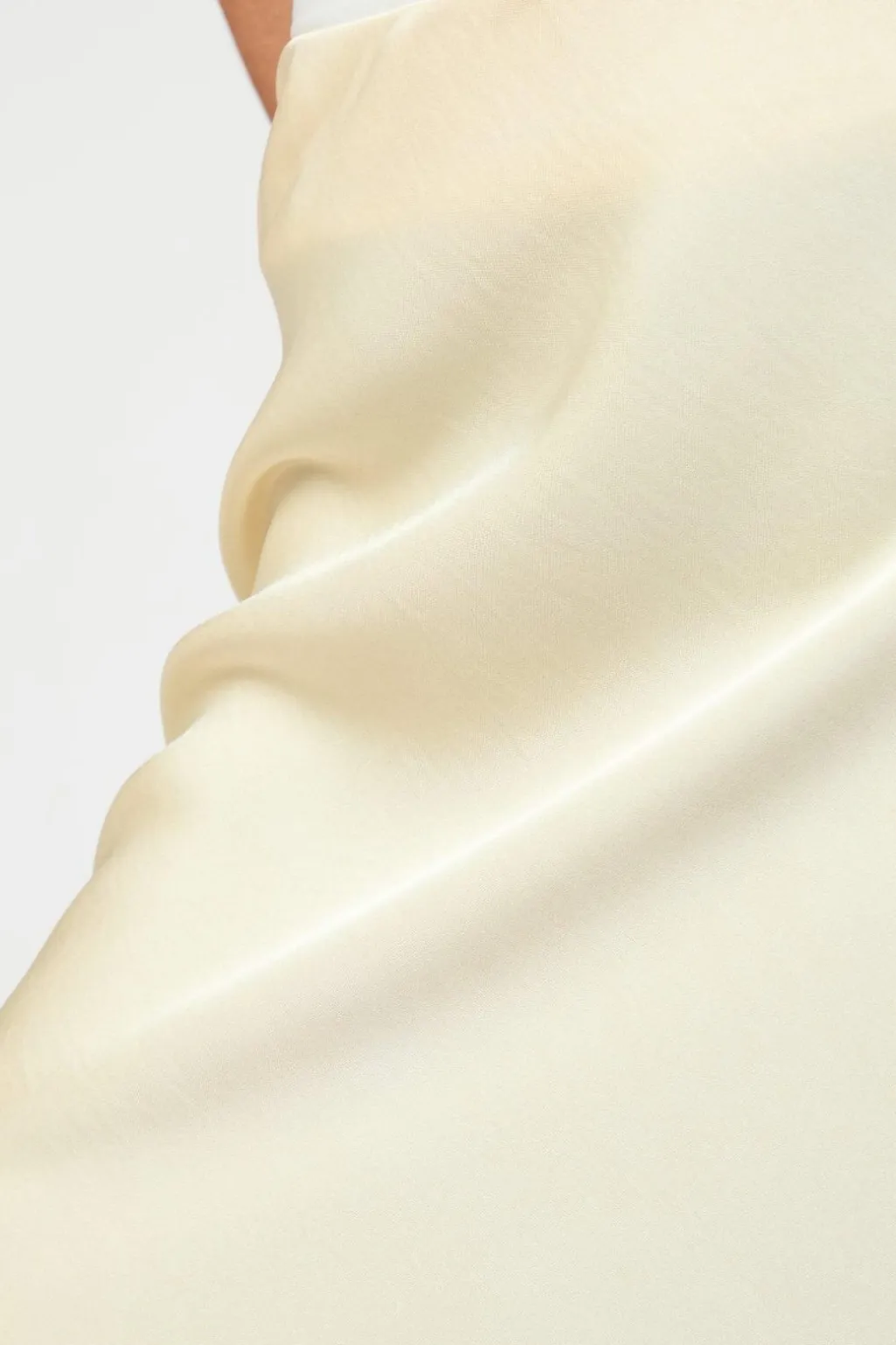 Lys gul nederdel fra Neo Noir i blød satin. Den skrå skæring og elastikken i taljen giver nederdelen et særpræget snit med god bevægelighed.