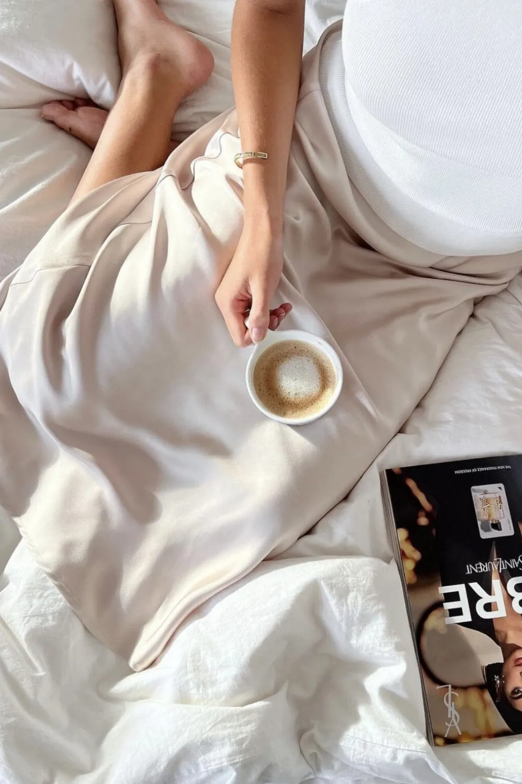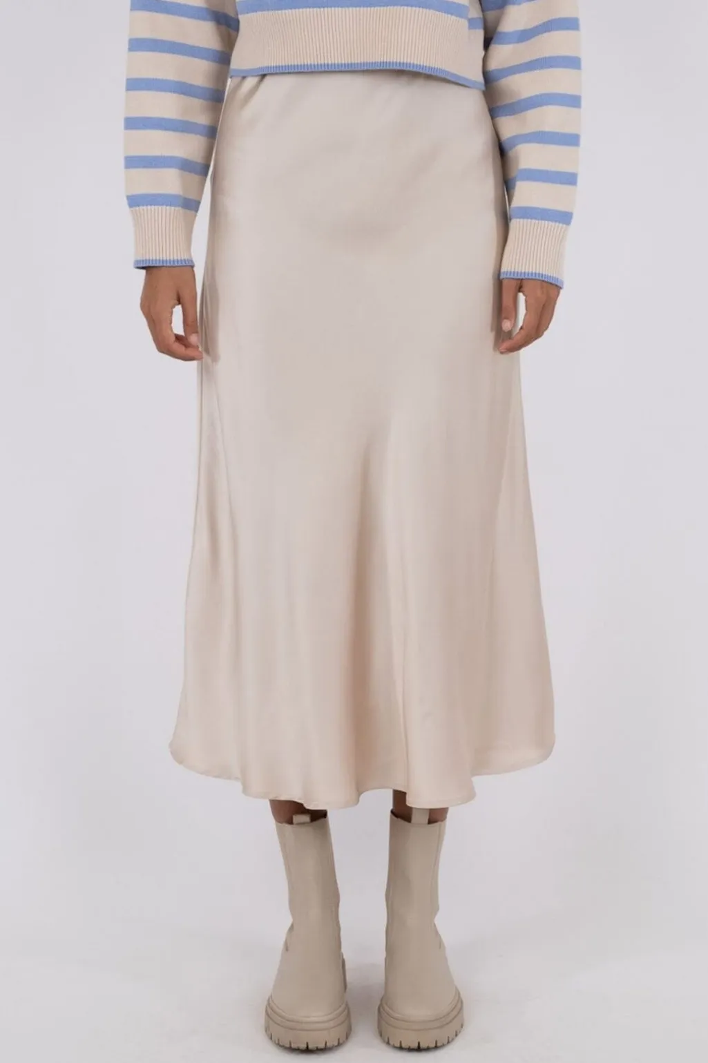 Satin-nederdel i champagnefarvet polyester med skrå snit. Den bløde satin giver et blankt udtryk, og nederdelen går til midt på skinnebenet med en løs pasform.