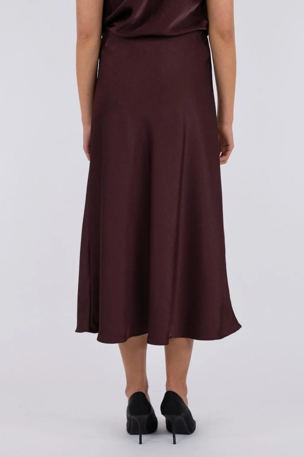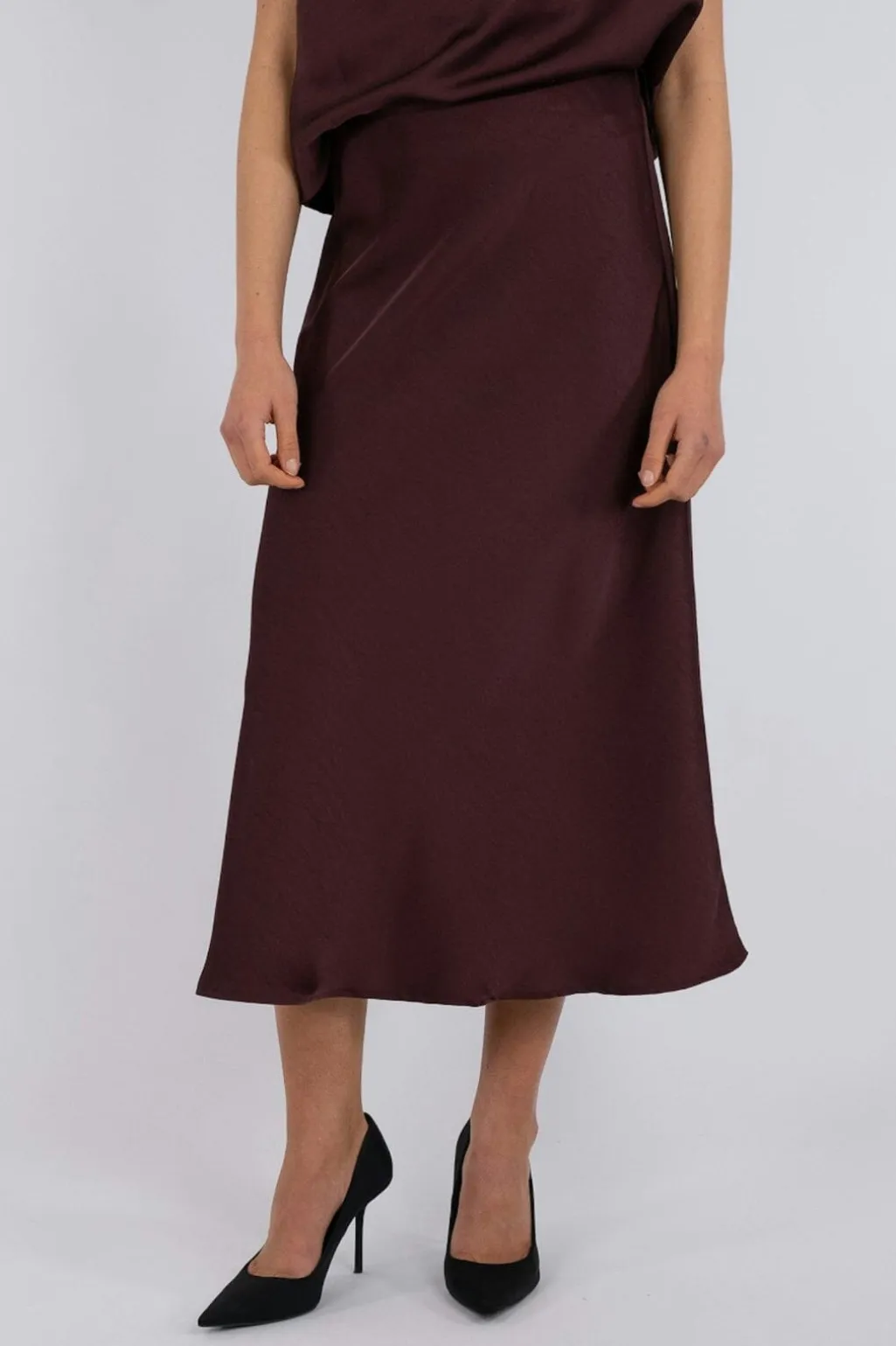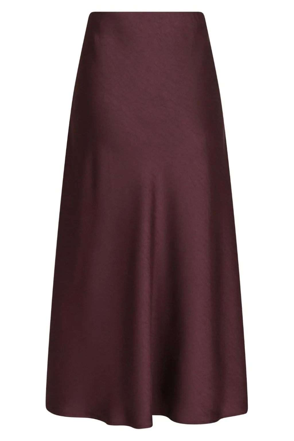Lang nederdel i blødt satin med en dyb burgunderfarve. Den skrå skæring og den elastiske talje skaber en flot faldende silhuet fra talje til læg.