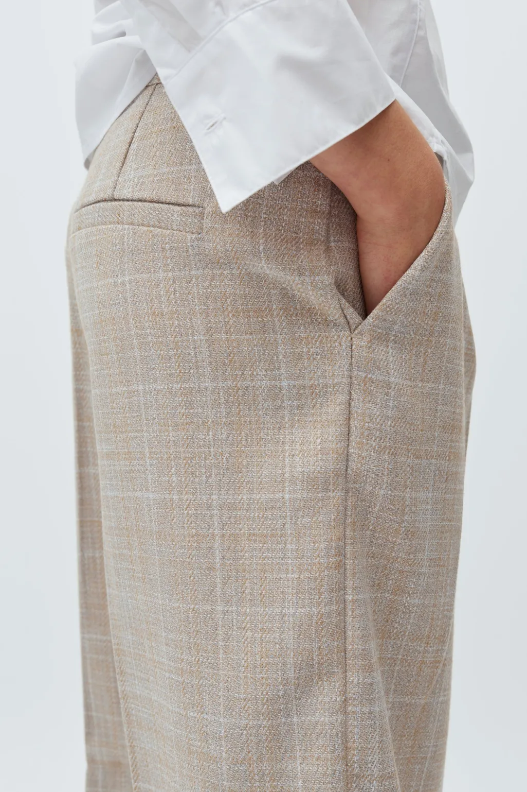 Shorts fra MbyM i beige med et ternet mønster. De har en løs pasform og en høj talje, der går til knæene.
