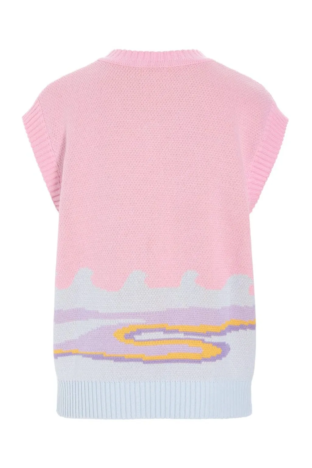 En ærmeløs vest fra Hunkøn i farven Pink Sea med et farverigt mønster af en gul sol og en fugl i en båd.