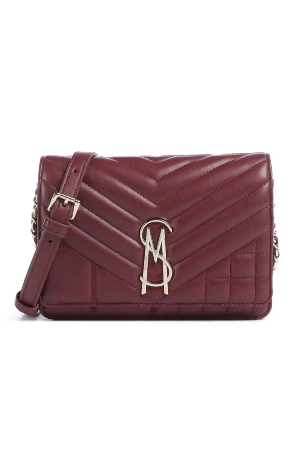 Vinrød taske fra Steve Madden med chevron-quiltet design. Tasken har en justerbar skulderrem og flere praktiske lukninger med både spænde, lynlås og magnet.