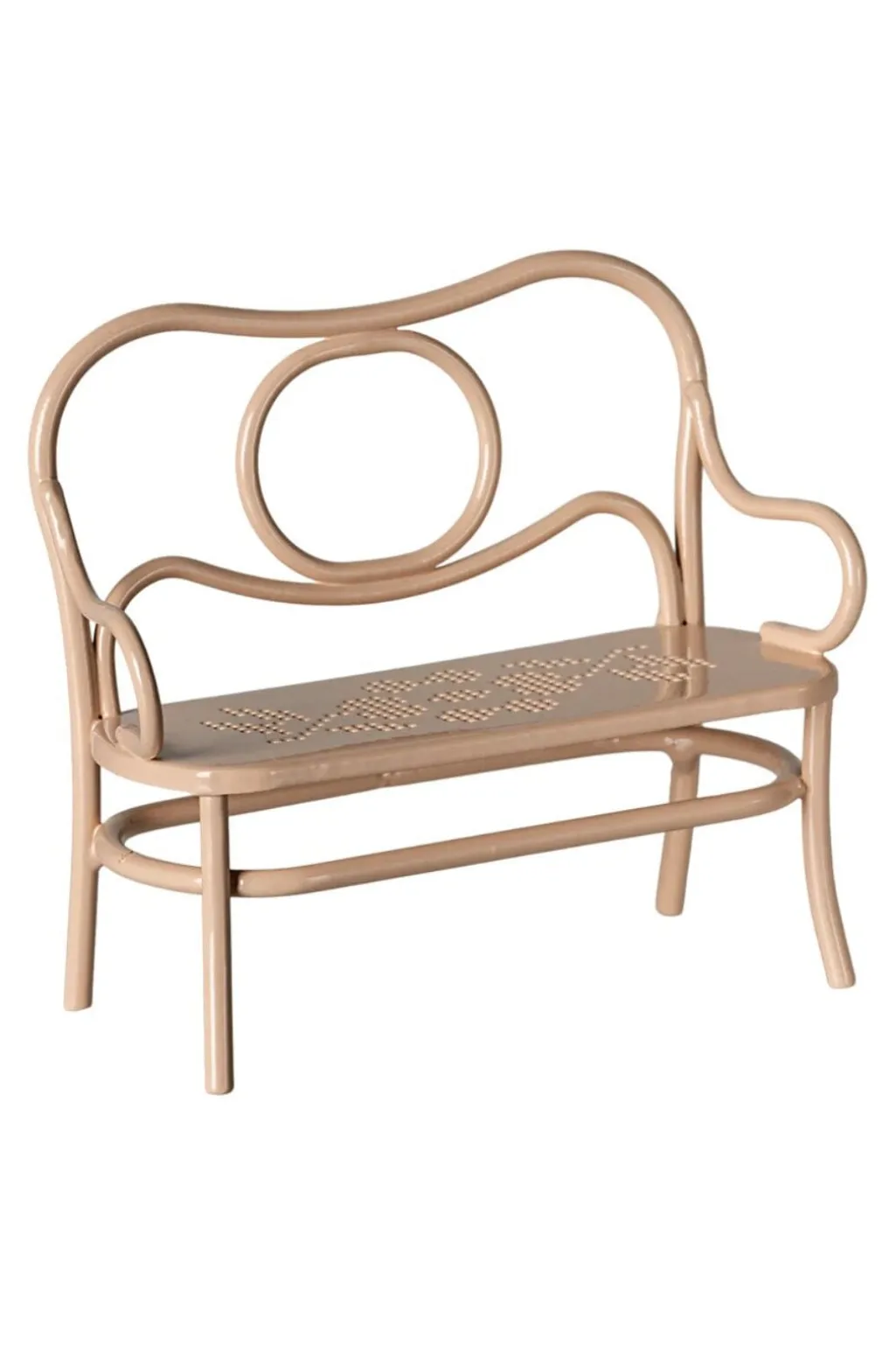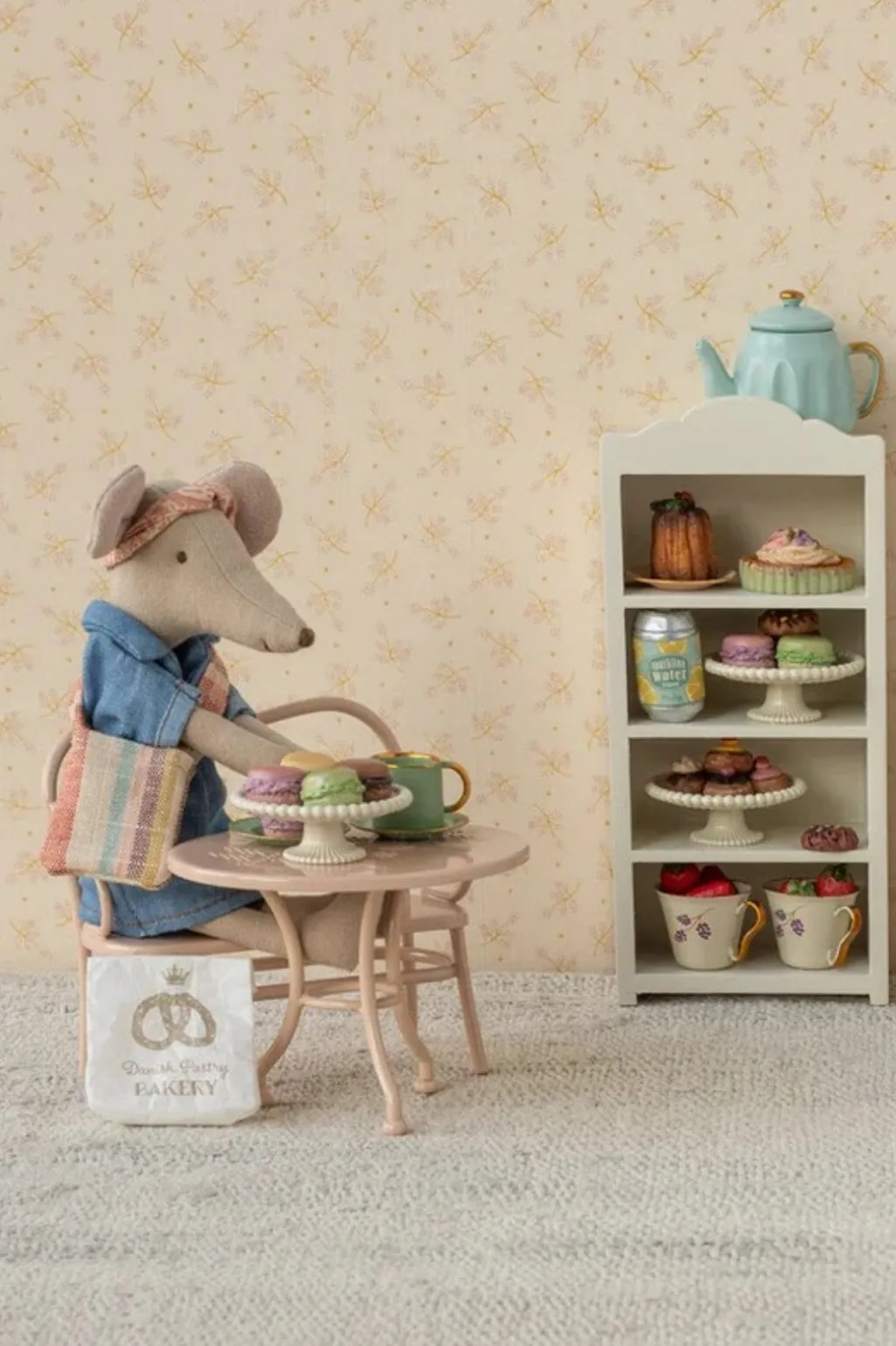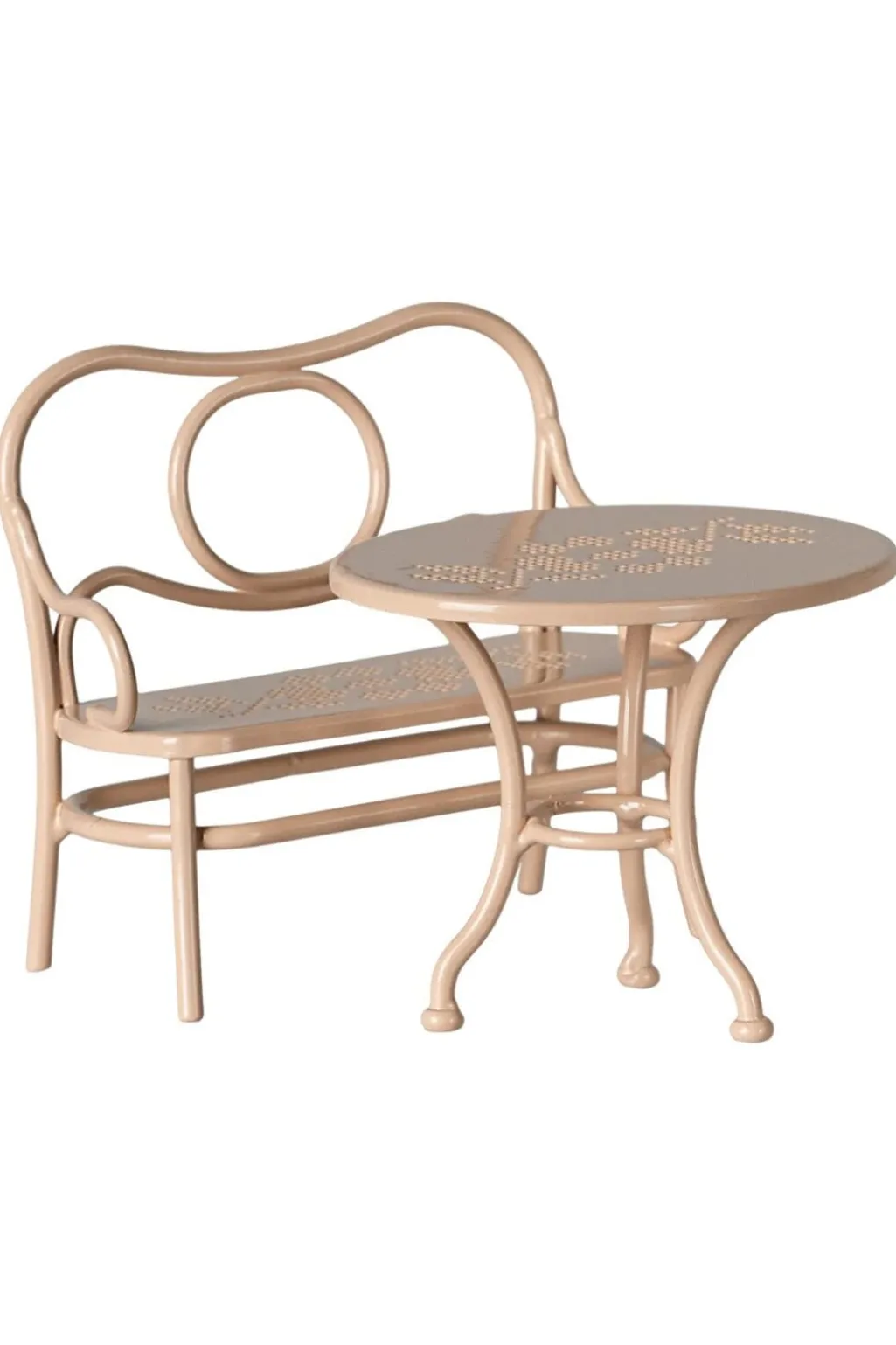 Lyserødt cafésæt fra Maileg med bord og bænk til mus. Møblerne har et fint hullet mønster og er lavet af metal, hvilket gør sættet stabilt under leg.