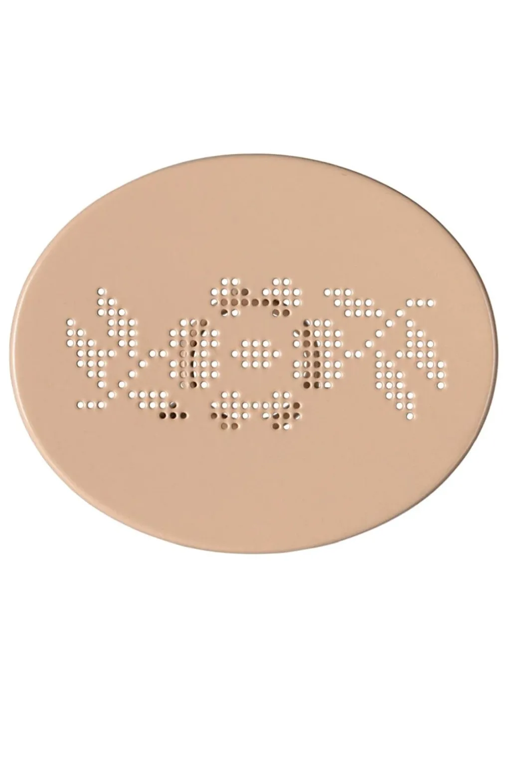 Det lyserøde metal har et fint hulmønster på både bord og bænk. De små huller skaber et let og luftigt udtryk.