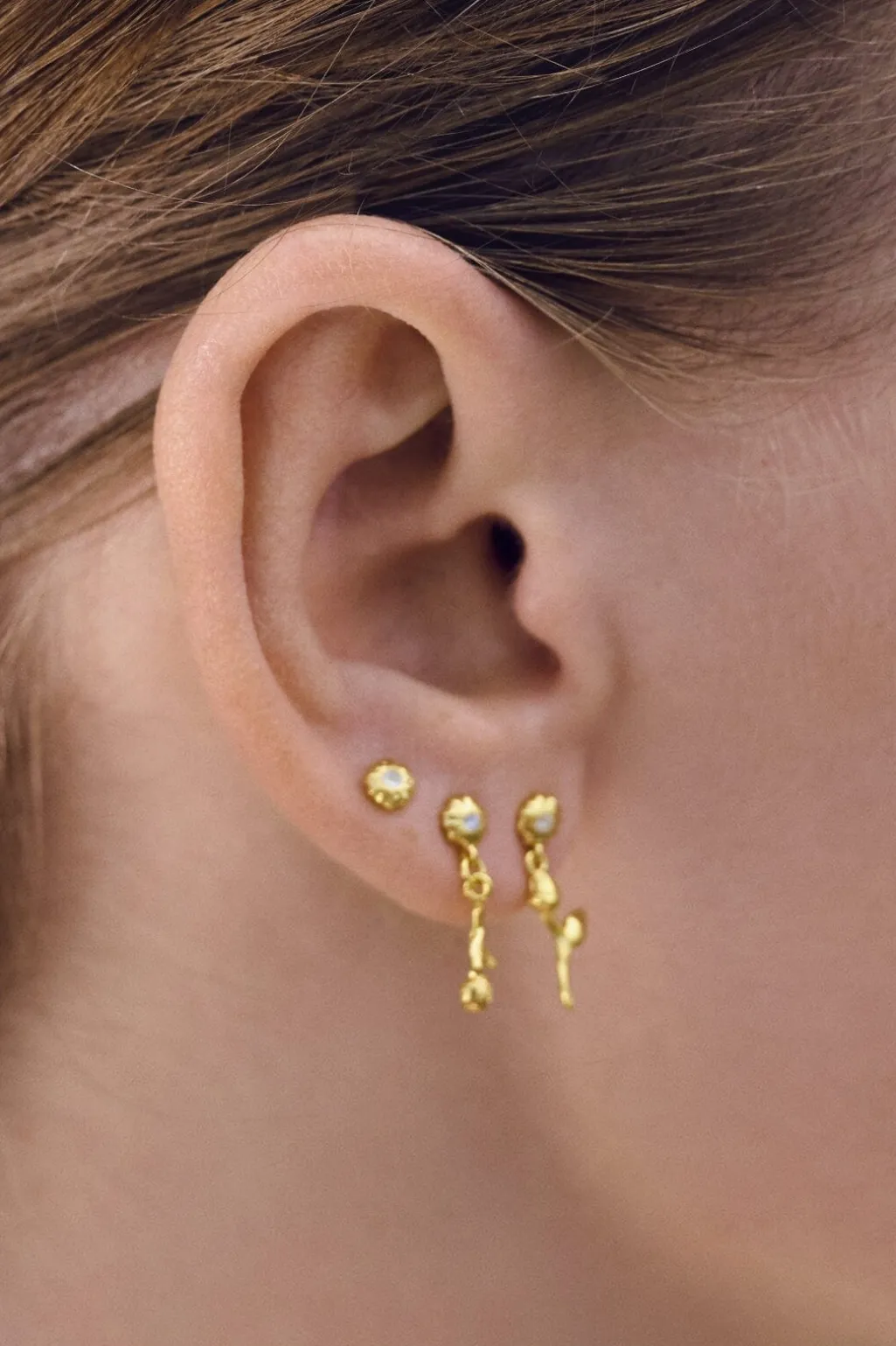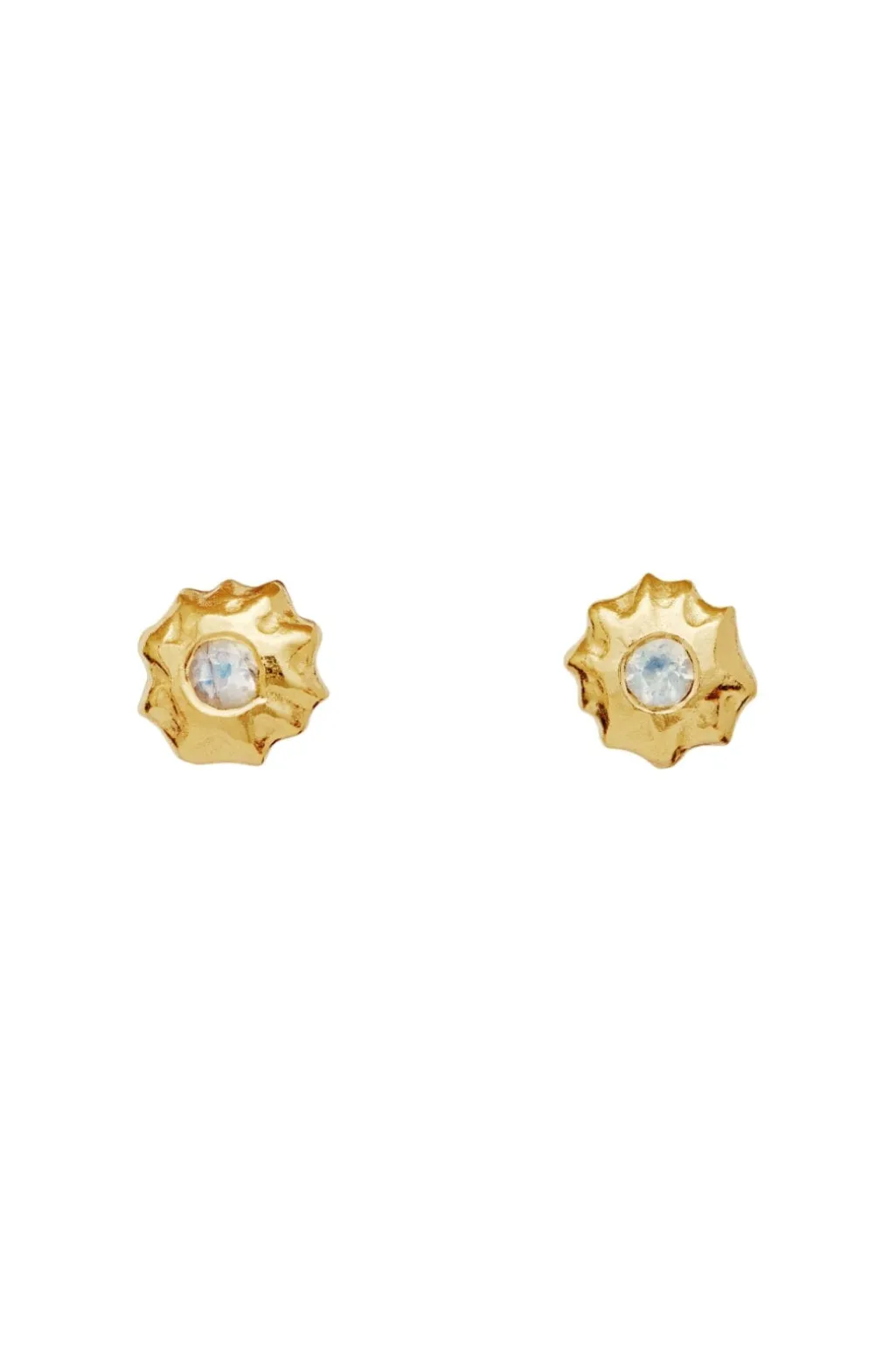 Små ørestikkere fra Maanesten med stjerneformet design. Øreringene har en struktureret overflade og en rainbow moonstone i midten, der skaber dybde i det gyldne design.