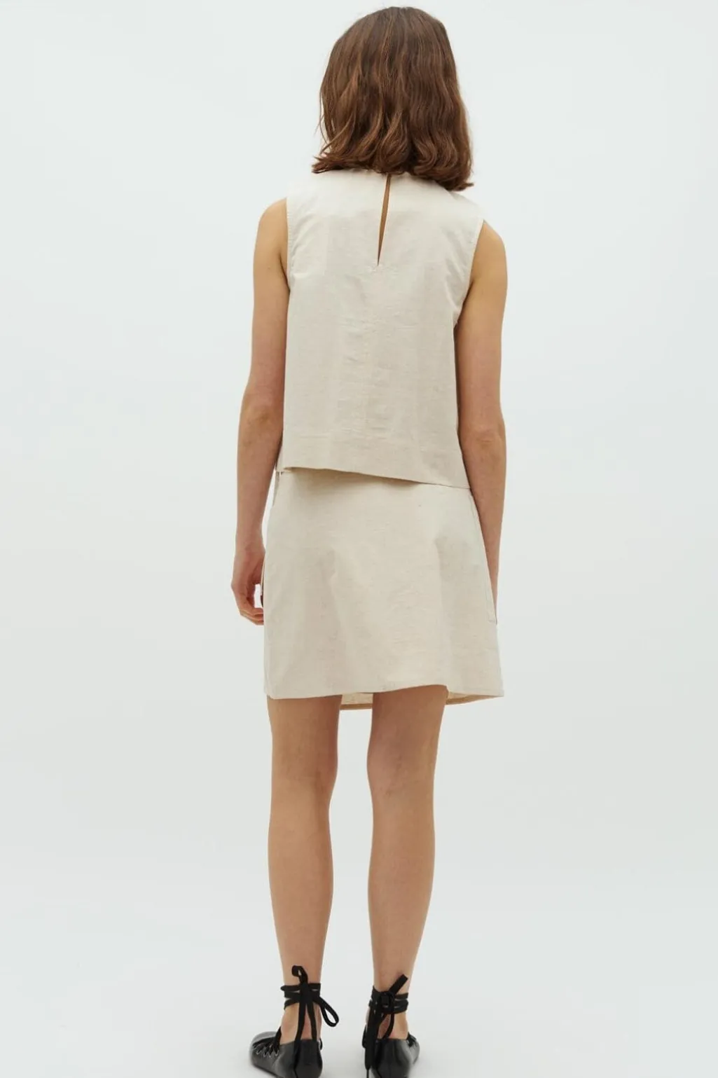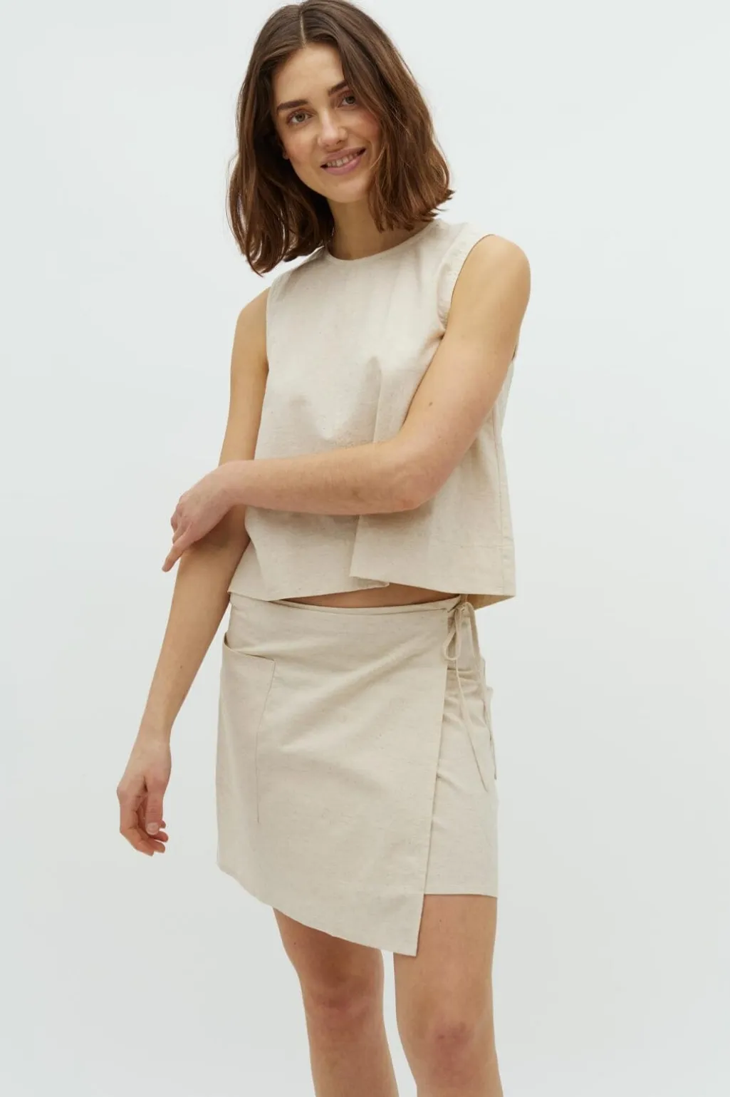 Beige nederdel fra Global Funk i en blanding af bomuld og hør. Nederdelen har en lomme på venstre side og bindebånd i taljen. Den går til midt på låret.