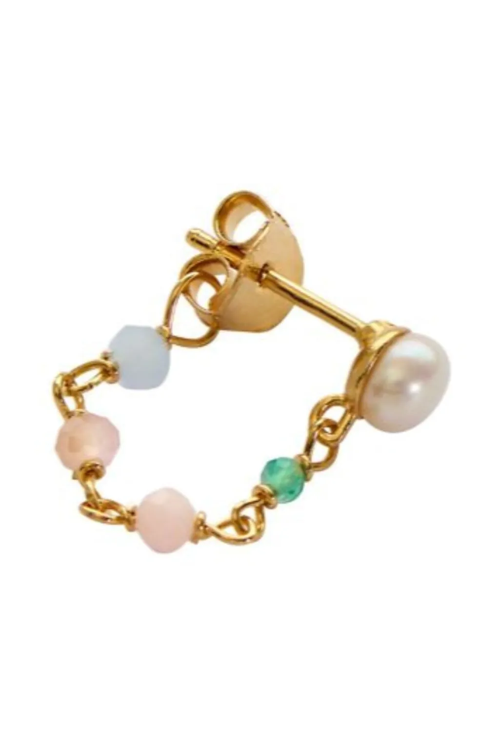 En enkelt ørering fra Stine A, lavet af 18 karat forgyldt 925 sterlingsølv med en perle og farvede perler på en kæde.