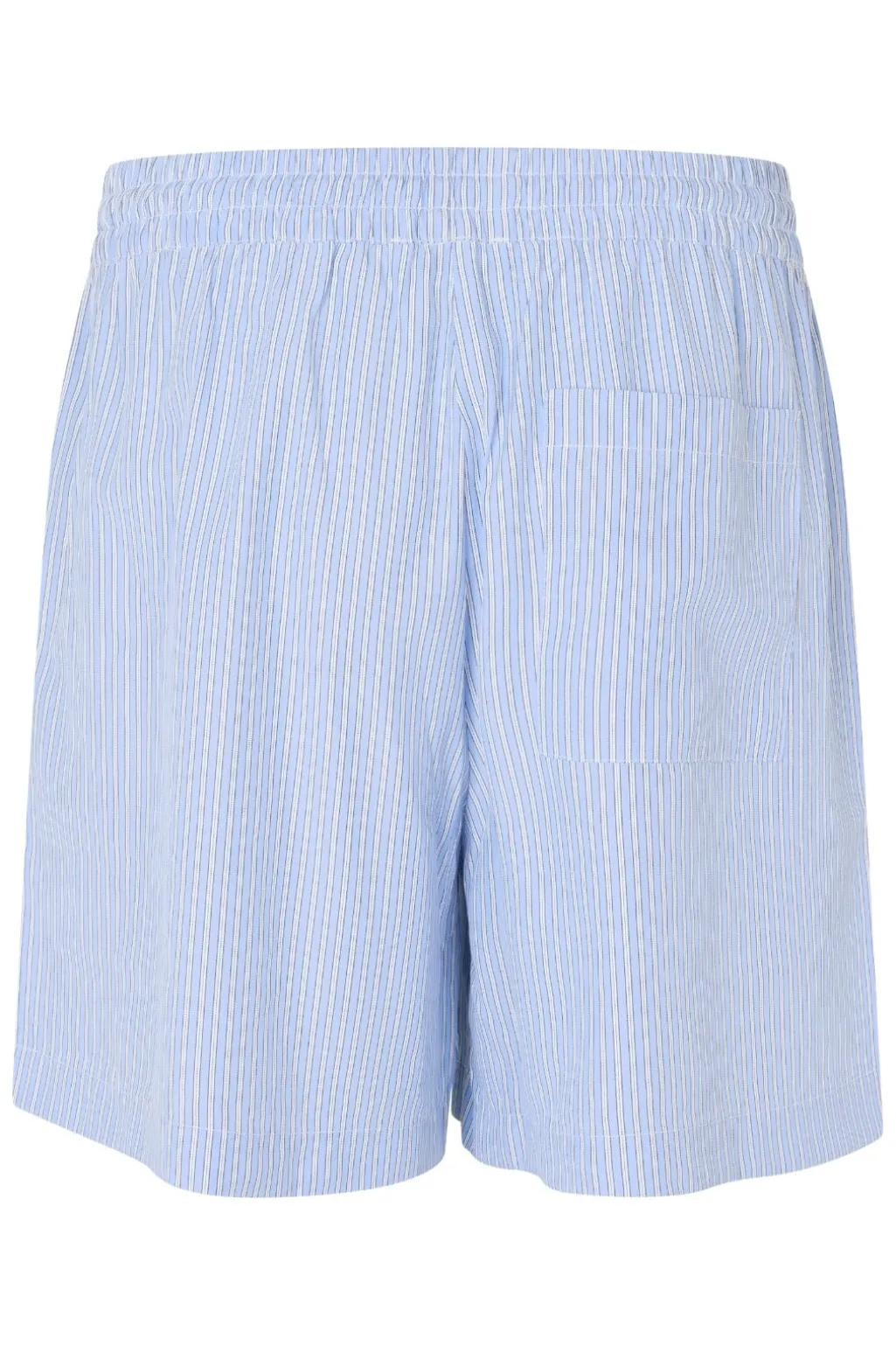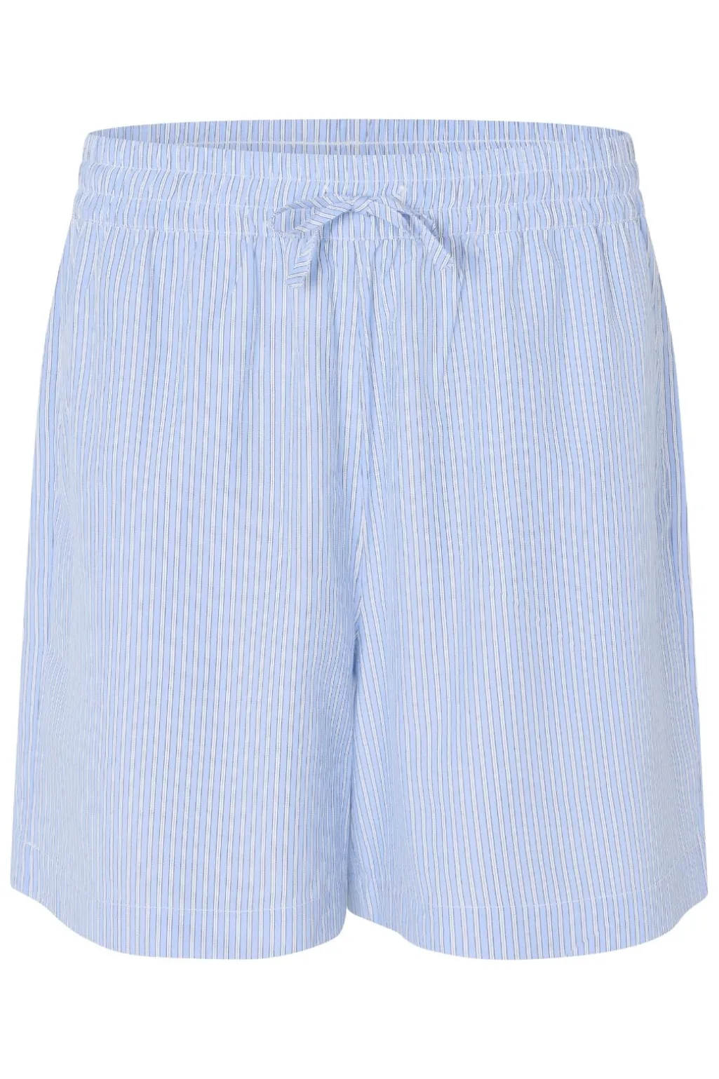 Stribede shorts fra MbyM med blå og hvide lodrette striber. Shortsene har en elastisk talje med snøre og en regular fit, der når til låret.