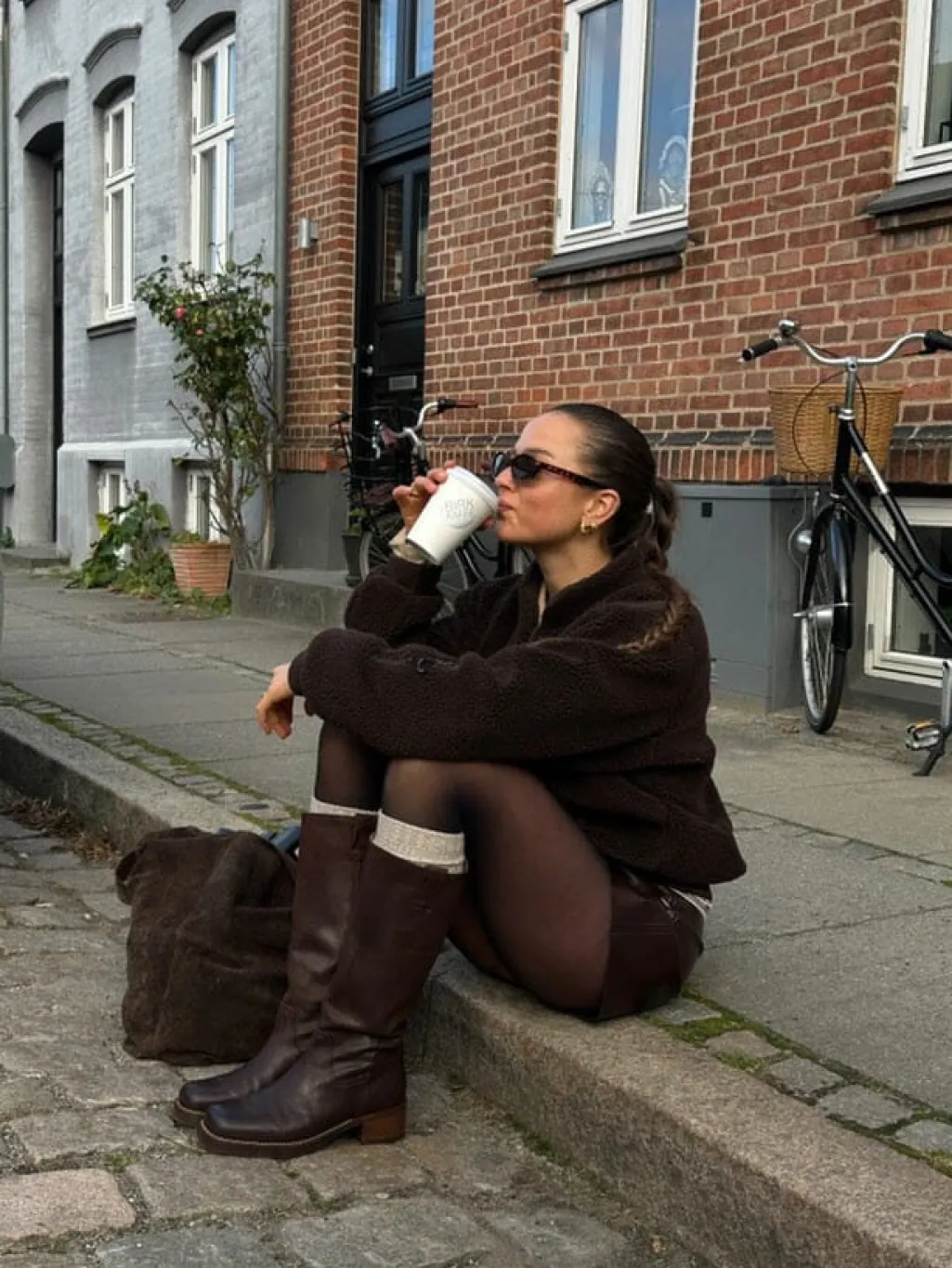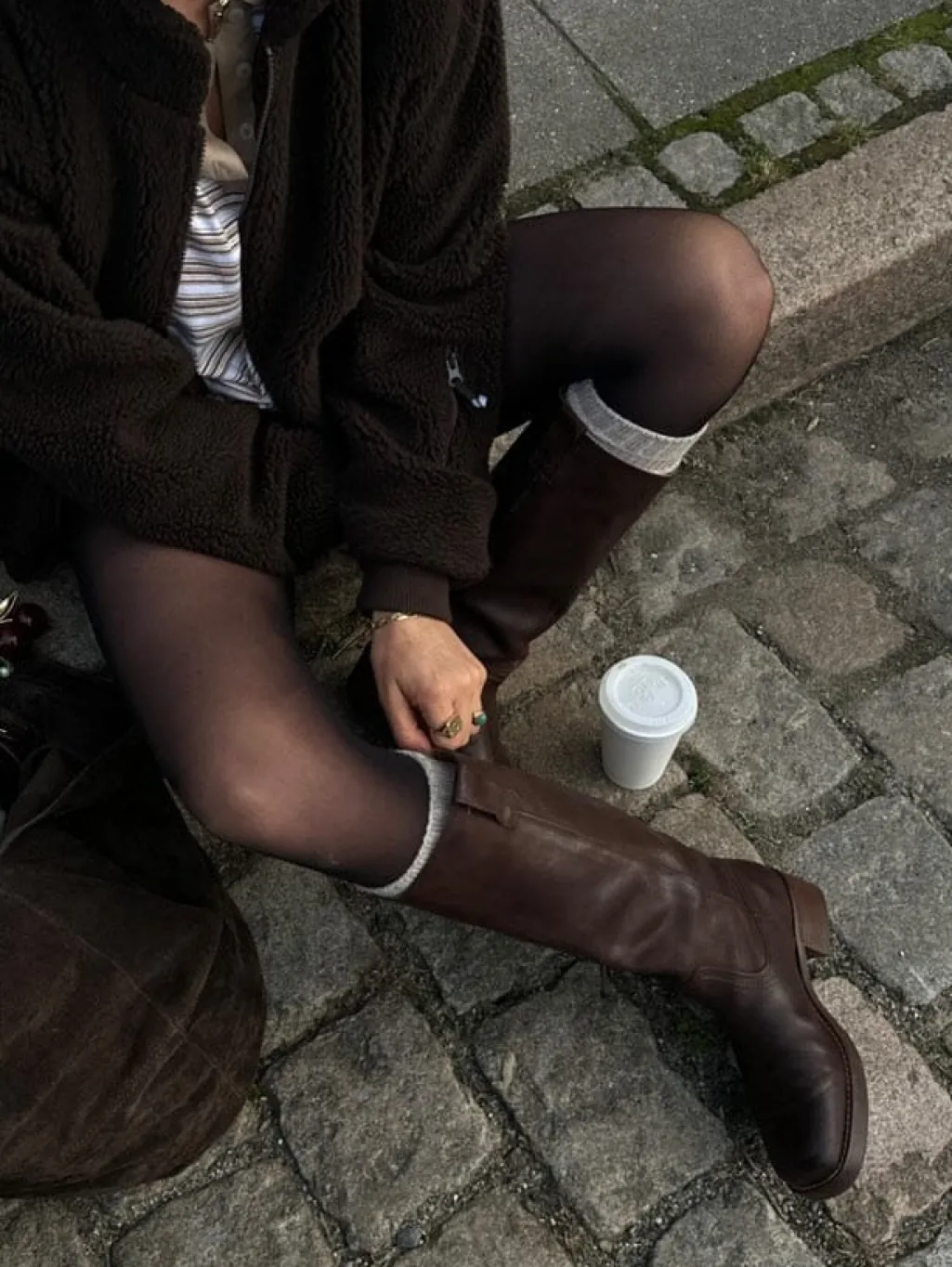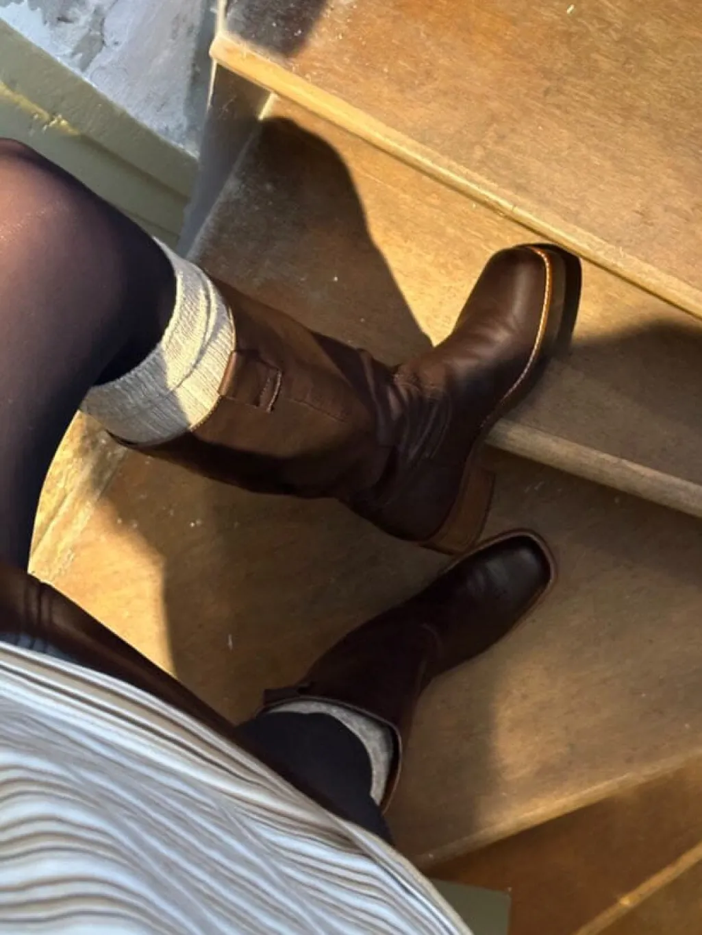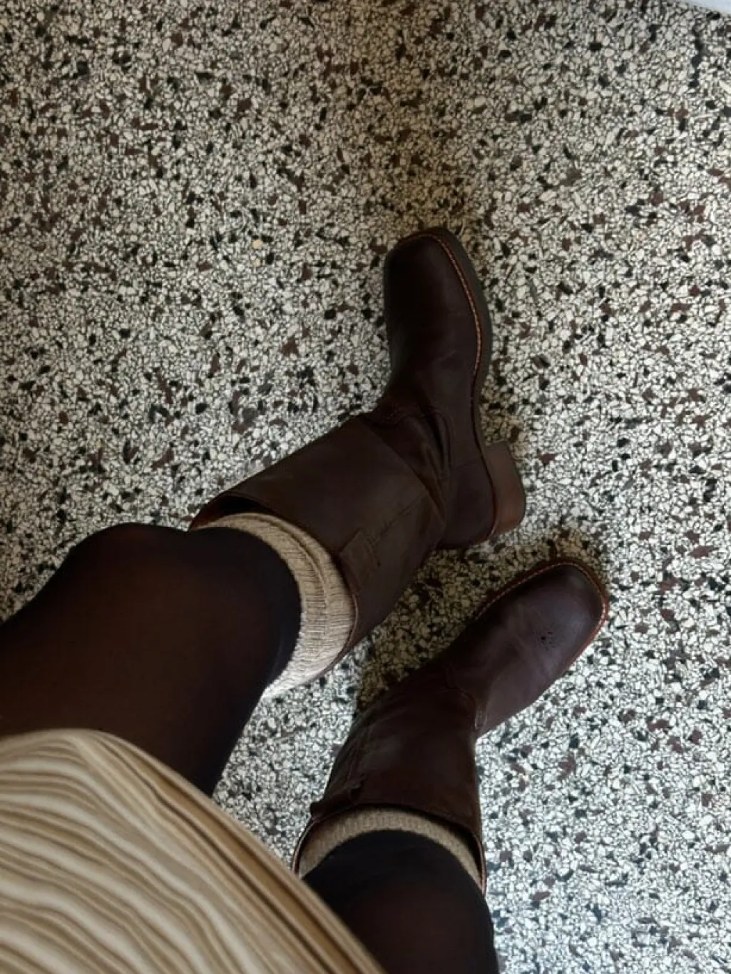 Brun læderstøvle med høj skaftlængde og firkantet tå. Støvlen har en blokhæl og er lavet i et enkelt design uden lukning, der gør den nem at tage på.