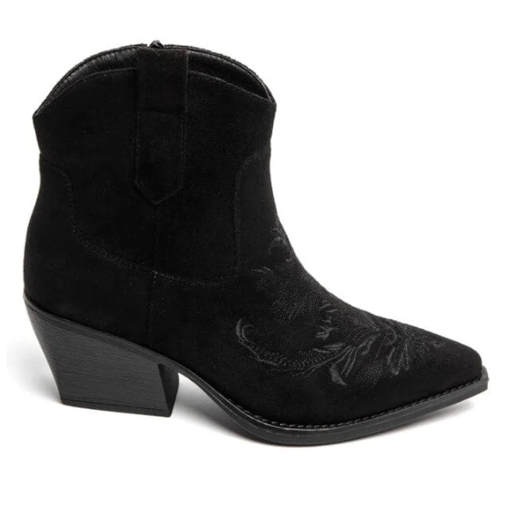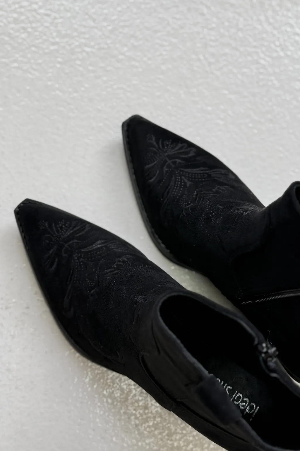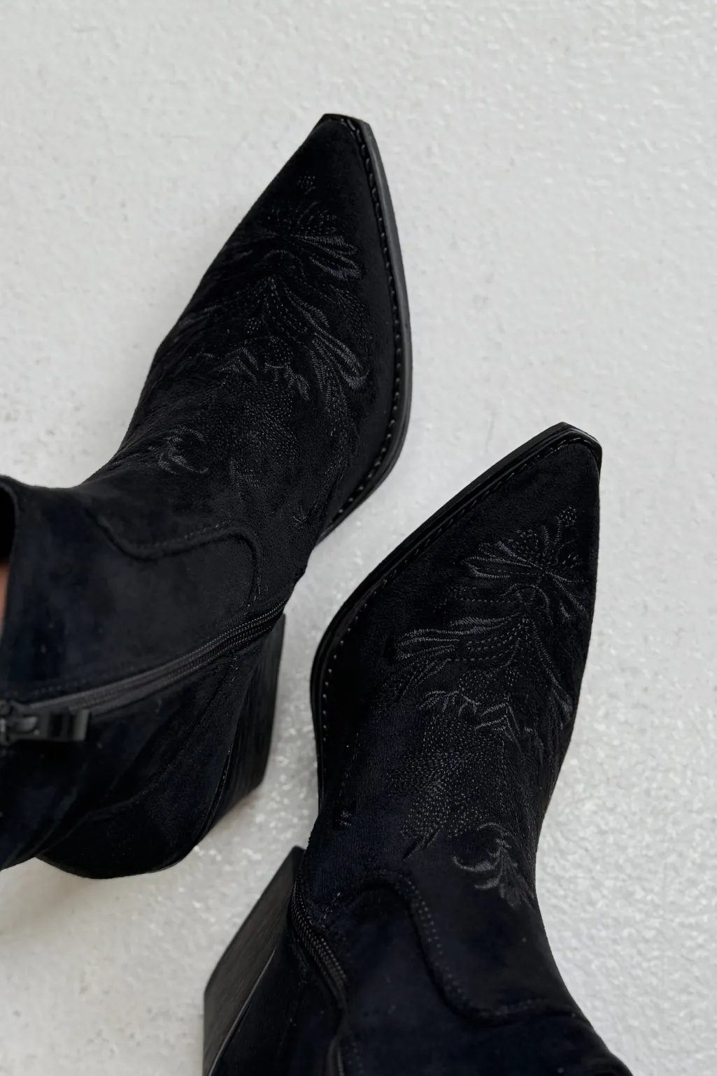 Sort støvle fra Bloom med broderet mønster og spids tå. Støvlen har en block heel og lynlås i siden.